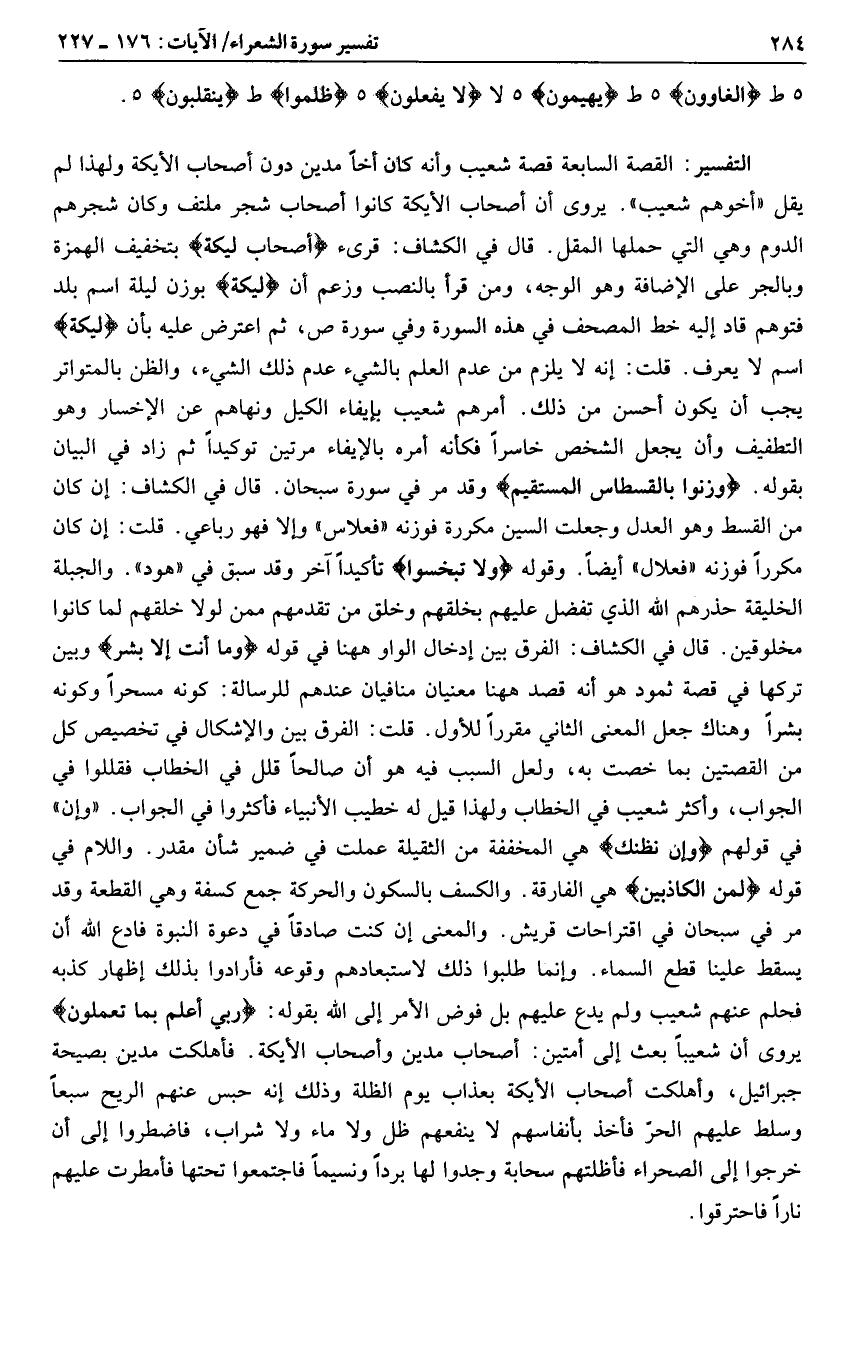 قال في الكشاف: قرىء أصحاب ليكة بتخفيف الهمزة وبالجر على الإضافة وهو الوجه، ومن قرأ بالنصب وزعم أن ليكة بوزن ليلة اسم بلد فتوهم قاد إليه خط المصحف في هذه السورة وفي سورة ص، ثم اعترض عليه بأن ليكة اسم لا يعرف. قلت: إنه لا يلزم من عدم العلم بالشيء عدم ذلك الشيء، والظن بالمتواتر يجب أن يكون أحسن من ذلك. أمرهم شعيب بإيفاء الكيل ونهاهم عن الإخسار وهو التطفيف وأن يجعل الشخص خاسرا فكأنه أمره بالإيفاء مرتين توكيدا ثم زاد في البيان بقوله. وَزِنُوا بِالْقِسْطاسِ الْمُسْتَقِيمِ وقد مر في سورة سبحان. قال في الكشاف: إن كان من القسط وهو العدل وجعلت السين مكررة فوزنه «فعلاس» وإلا فهو رباعي. قلت: إن كان مكررا فوزنه «فعلال» أيضا. وقوله وَلا تَبْخَسُوا تأكيدا آخر وقد سبق في «هود» . والجبلة الخليقة حذرهم الله الذي تفضل عليهم بخلقهم وخلق من تقدمهم ممن لولا خلقهم لما كانوا مخلوقين. قال في الكشاف: الفرق بين إدخال الواو هاهنا في قوله وَما أَنْتَ إِلَّا بَشَرٌ وبين تركها في قصة ثمود هو أنه قصد هاهنا معنيان منافيان عندهم للرسالة: كونه مسحرا وكونه بشرا وهناك جعل المعنى الثاني مقررا للأول. قلت: الفرق بين والإشكال في تخصيص كل من القصتين بما خصت به، ولعل السبب فيه هو أن صالحا قلل في الخطاب فقللوا في الجواب، وأكثر شعيب في الخطاب ولهذا قيل له خطيب الأنبياء فأكثروا في الجواب. «وإن» في قولهم وَإِنْ نَظُنُّكَ هي المخففة من الثقيلة عملت في ضمير شأن مقدر. واللام في قوله لَمِنَ الْكاذِبِينَ هي الفارقة. والكسف بالسكون والحركة جمع كسفة وهي القطعة وقد مر في سبحان في اقتراحات قريش. والمعنى إن كنت صادقا في دعوة النبوة فادع الله أن يسقط علينا قطع السماء. وإنما طلبوا ذلك لاستبعادهم وقوعه فأرادوا بذلك إظهار كذبه فحلم عنهم شعيب ولم يدع عليهم بل فوض الأمر إلى الله بقوله: رَبِّي أَعْلَمُ بِما تَعْمَلُونَ