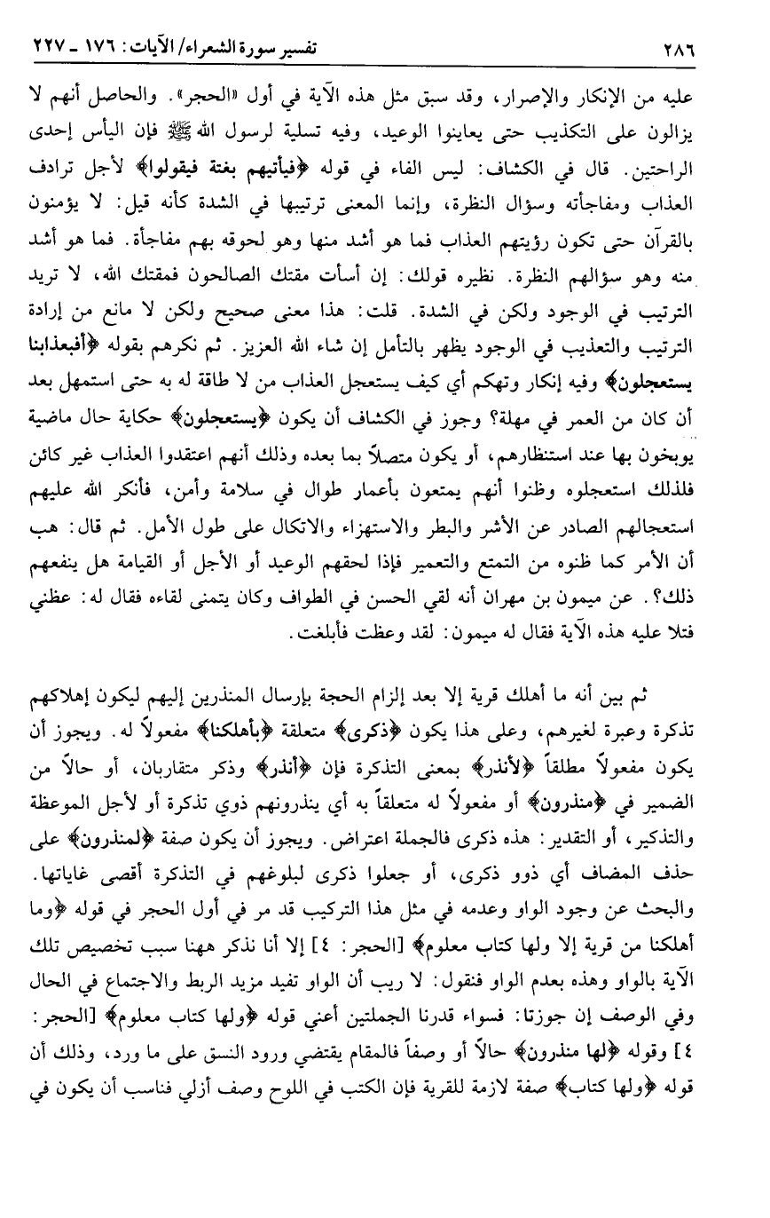 4] وقوله لَها مُنْذِرُونَ حالا أو وصفا فالمقام يقتضي ورود النسق على ما ورد، وذلك أن قوله وَلَها كِتابٌ صفة لازمة للقرية فإن الكتب في اللوح وصف أزلي فناسب أن يكون في