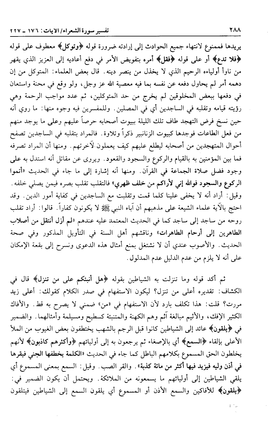 ثم أكد قوله وما تنزلت به الشياطين بقوله هَلْ أُنَبِّئُكُمْ عَلى مَنْ تَنَزَّلُ قال في الكشاف: تقديره أعلى من تنزل؟ ليكون الاستفهام في صدر الكلام كقولك: أعلى زيد مررت؟ قلت: هذا تكلف بارد لأن الاستفهام في «من» ضمني لا يصرح به قط. والأفاك الكثير الإفك، والأثيم مبالغة آثم وهم الكهنة والمتنبئة كسطيح ومسيلمة وأمثالهما. والضمير في يُلْقُونَ عائد إلى الشياطين كانوا قبل الرجم بالشهب يختطفون بعض الغيوب من الملأ الأعلى بإلقاء السَّمْعَ أي بالإصغاء ثم يرجعون به إلى أوليائهم وَأَكْثَرُهُمْ كاذِبُونَ لأنهم يخلطون الحق المسموع بكلامهم الباطل كما
