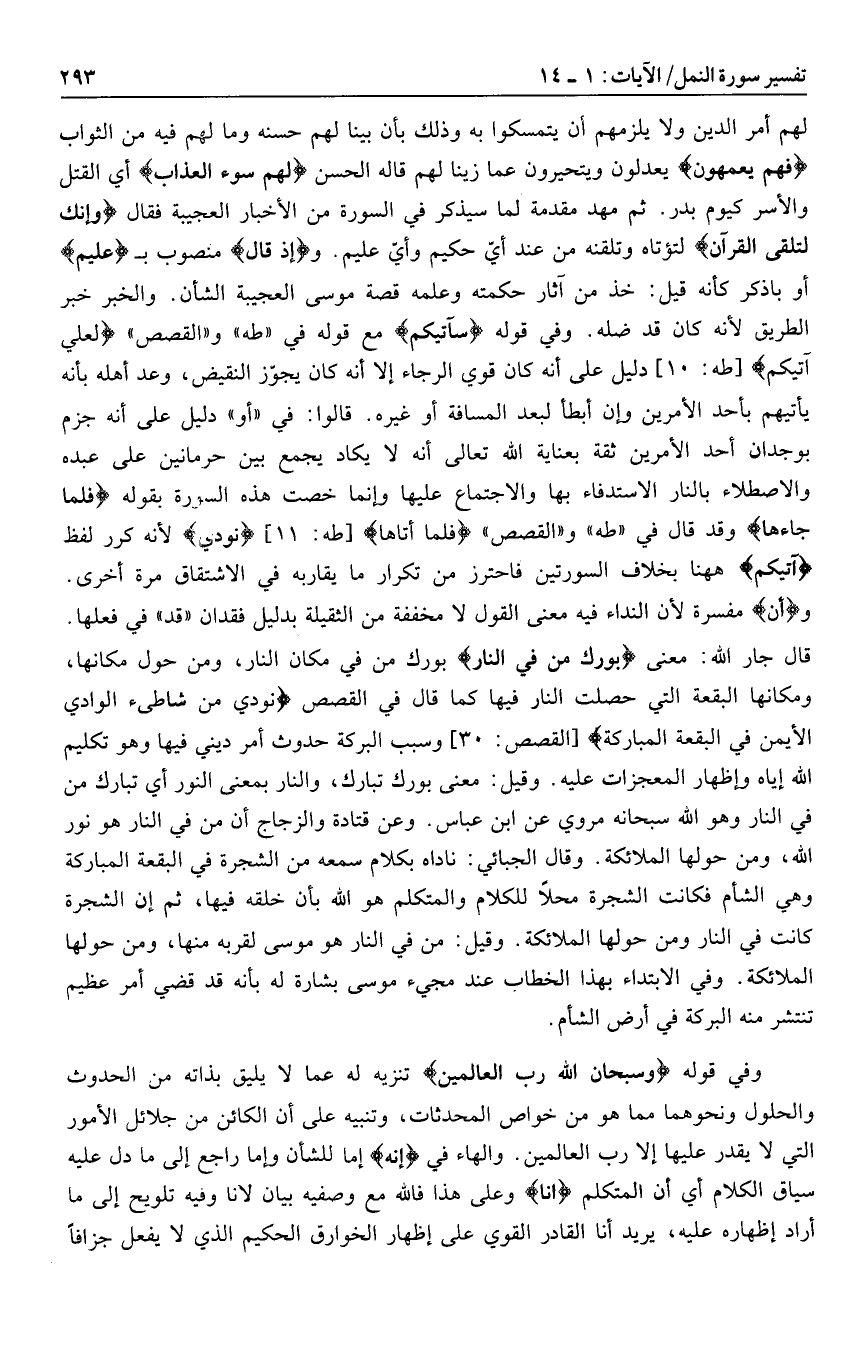 قال جار الله: معنى بُورِكَ مَنْ فِي النَّارِ بورك من في مكان النار، ومن حول مكانها، ومكانها البقعة التي حصلت النار فيها كما قال في القصص نُودِيَ مِنْ شاطِئِ الْوادِ الْأَيْمَنِ فِي الْبُقْعَةِ الْمُبارَكَةِ [القصص: 30] وسبب البركة حدوث أمر ديني فيها وهو تكليم الله إياه وإظهار المعجزات عليه. وقيل: معنى بورك تبارك، والنار بمعنى النور أي تبارك من في النار وهو الله سبحانه مروي عن ابن عباس. وعن قتادة والزجاج أن من في النار هو نور الله، ومن حولها الملائكة. وقال الجبائي: ناداه بكلام سمعه من الشجرة في البقعة المباركة وهي الشام فكانت الشجرة محلا للكلام والمتكلم هو الله بأن خلقه فيها، ثم إن الشجرة كانت في النار ومن حولها الملائكة. وقيل: من في النار هو موسى لقربه منها، ومن حولها الملائكة. وفي الابتداء بهذا الخطاب عند مجيء موسى بشارة له بأنه قد قضي أمر عظيم تنتشر منه البركة في أرض الشام.