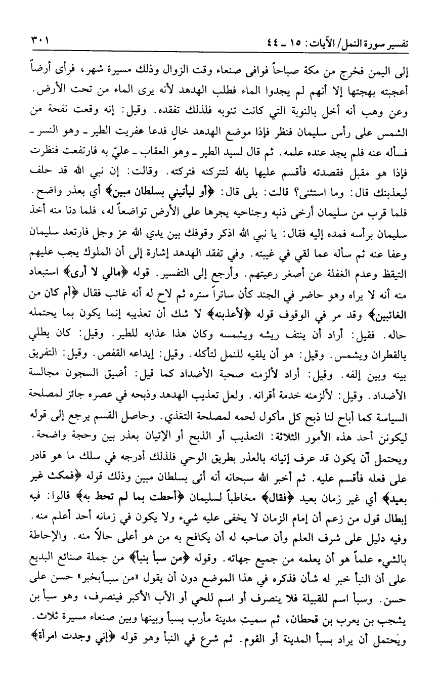 فلما قرب من سليمان أرخى ذنبه وجناحيه يجرها على الأرض تواضعا له، فلما دنا منه أخذ سليمان برأسه فمده إليه فقال: يا نبي الله اذكر وقوفك بين يدي الله عز وجل فارتعد سليمان وعفا عنه ثم سأله عما لقي في غيبته. وفي تفقد الهدهد إشارة إلى أن الملوك يجب عليهم التيقظ وعدم الغفلة عن أصغر رعيتهم. وأرجع إلى التفسير. قوله ما لِيَ لا أَرَى استبعاد منه أنه لا يراه وهو حاضر في الجند كأن ساترا ستره ثم لاح له أنه غائب فقال أَمْ كانَ مِنَ الْغائِبِينَ وقد مر في الوقوف قوله لَأُعَذِّبَنَّهُ لا شك أن تعذيبه إنما يكون بما يحتمله حاله. فقيل: أراد أن ينتف ريشه ويشمسه وكان هذا عذابه للطير. وقيل: كان يطلي بالقطران ويشمس. وقيل: هو أن يلقيه للنمل لتأكله. وقيل: إيداعه القفص. وقيل: التفريق بينه وبين إلفه. وقيل: أراد لألزمنه صحبة الأضداد كما قيل: أضيق السجون مجالسة الأضداد. وقيل: لألزمنه خدمة أقرانه. ولعل تعذيب الهدهد وذبحه في عصره جائز لمصلحة السياسة كما أباح لنا ذبح كل مأكول لحمه لمصلحة التغذي. وحاصل القسم يرجع إلى قوله ليكونن أحد هذه الأمور الثلاثة: التعذيب أو الذبح أو الإتيان بعذر بين وحجة واضحة.