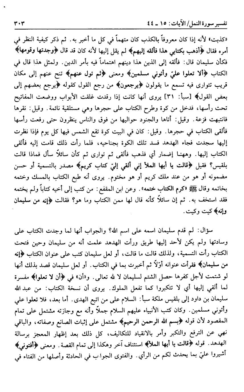 سؤال: لم قدم سليمان اسمه على اسم الله؟ والجواب أنها لما وجدت الكتاب على وسادتها ولم يكن لأحد إليها طريق ورأت الهدهد علمت أنه من سليمان وحين فتحت الكتاب رأت التسمية، ولذلك قالت ما قالت، أو لعل سليمان كتب على عنوان الكتاب إِنَّهُ مِنْ سُلَيْمانَ فقرأت عنوانه أوّلا ثم أخبرت بما في الكتاب. أو لعل سليمان قصد بذلك أنها لو شتمت لأجل كفرها حصل الشتم لسليمان لا لله تعالى. و «أن» في أَنْ لا تَعْلُوا مفسرة لما ألقي إليها أي لا تتكبروا كما تفعل الملوك.