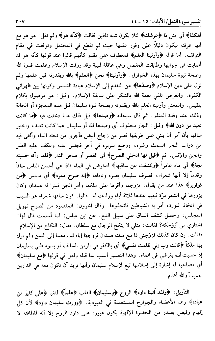 وَلَقَدْ آتَيْنا داوُدَ الروح وَسُلَيْمانَ القلب عِلْماً لدنيا عَلى كَثِيرٍ مِنْ عِبادِهِ وهم الأعضاء والجوارح المستعملة في العبودية. وَوَرِثَ سُلَيْمانُ داوُدَ لأن كل إلهام وفيض يصدر من الحضرة الإلهية يكون عبوره على داود الروح إلا أنه للطافته لا