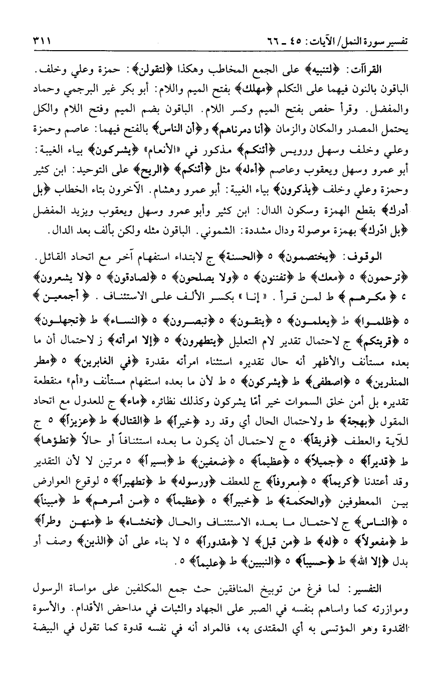 تُرْحَمُونَ هـ مَعَكَ ط تُفْتَنُونَ هـ وَلا يُصْلِحُونَ هـ لَصادِقُونَ هـ لا يَشْعُرُونَ هـ مَكْرِهِمْ ط لمن قرأ. «إنا» بكسر الألف على الاستئناف. أَجْمَعِينَ هـ ظَلَمُوا ط يَعْلَمُونَ هـ يَتَّقُونَ هـ تُبْصِرُونَ هـ النِّساءِ ط تَجْهَلُونَ هـ قَرْيَتِكُمْ ج لاحتمال تقدير لام التعليل يَتَطَهَّرُونَ هـ إِلَّا امْرَأَتَهُ ز لاحتمال أن ما بعده مستأنف والأظهر أنه حال تقديره استثناء امرأته مقدرة في الْغابِرِينَ هـ مَطَرُ الْمُنْذَرِينَ هـ اصْطَفى ط يُشْرِكُونَ هـ ط لأن ما بعده استفهام مستأنف و «أم» منقطعة تقديره بل أمن خلق السموات خير أمّا يشركون وكذلك نظائره ماءً ج للعدول مع اتحاد المقول بَهْجَةٍ ط ولاحتمال الحال أي وقد رد خَيْراً ط الْقِتالُ ط عَزِيزاً هـ ج للآية والعطف فَرِيقاً هـ ج لاحتمال أن يكون ما بعده استئنافا أو حالا تَطَؤُها ط قَدِيراً هـ جَمِيلًا هـ عَظِيماً هـ ضِعْفَيْنِ ط يَسِيراً هـ مرتين لا لأن التقدير وقد أعتدنا كَرِيماً هـ مَعْرُوفاً ج للعطف وَرَسُولِهِ ط تَطْهِيراً هـ لوقوع العوارض بين المعطوفين وَالْحِكْمَةَ ط خَبِيراً هـ عَظِيماً هـ مِنْ أَمْرِهِمْ ط مُبِيناً هـ النَّاسِ ج لاحتمال ما بعده الاستئناف والحال تَخْشاهُ ط مِنْهُنَّ وَطَراً ط مَفْعُولًا هـ لَهُ ط مِنْ قَبْلُ لا مَقْدُوراً هـ لا بناء على أن الَّذِينَ وصف أو بدل إِلَّا اللَّهَ ط حَسِيباً هـ النَّبِيِّينَ ط عَلِيماً هـ.