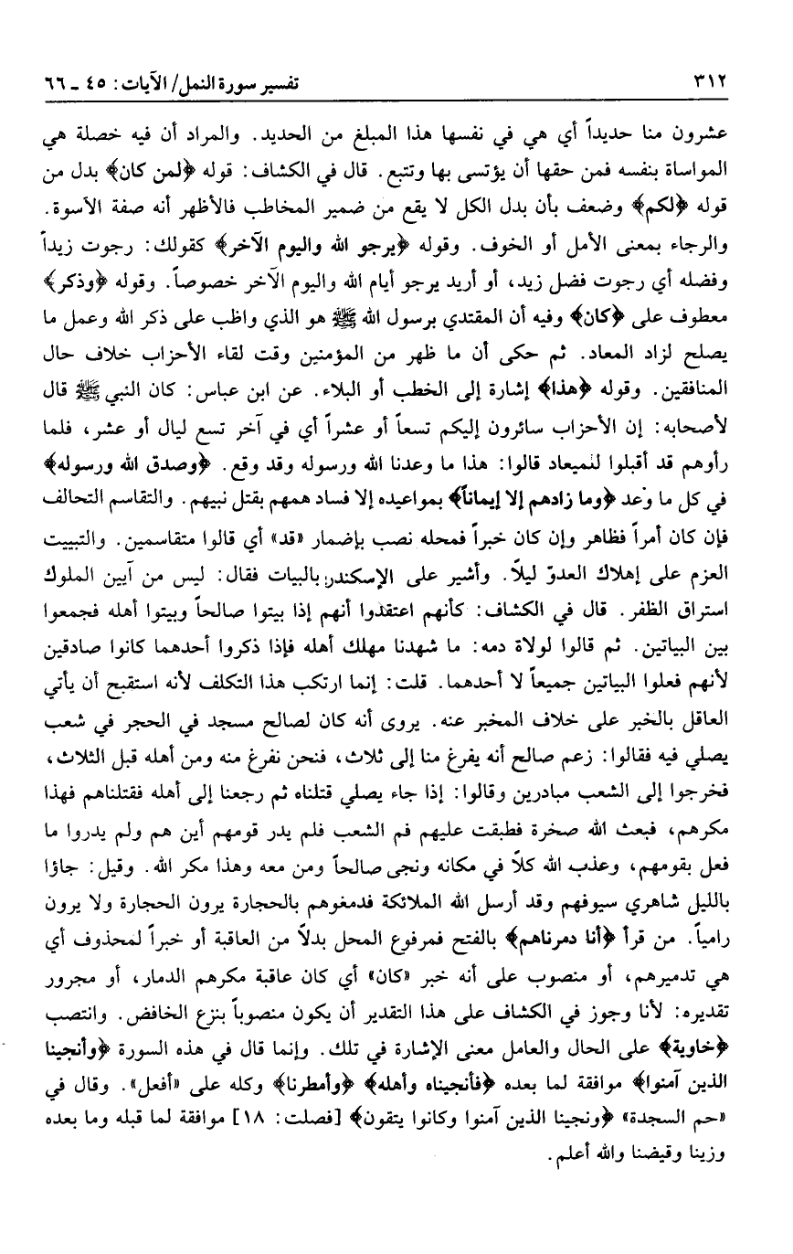 في باب الدين حق. ومعنى استعجالهم بالسيئة قبل الحسنة أنه تعالى قد مكنهم من التوصل إلى رحمة الله وثوابه فعدلوا إلى استعجال عذابه. وقال جار الله: خاطبهم صالح على حسب اعتقادهم وذلك أنهم قدروا في أنفسهم إن التوبة مقبولة عند رؤية العذاب فقالوا: متى وقعت العقوبة تبنا حينئذ، فالسيئة العقوبة، والحسنة التوبة، و «لولا» للتحضيض أي هلا تستغفرون قبل عيان عذابه لَعَلَّكُمْ تُرْحَمُونَ بأن يكشف العذاب عنكم. والحاصل أن التوبة يجب أن تقدم على رؤية العذاب ولا يجوز أن تؤخر، وفيه تنبيه على خطئهم وتجهيل لهم قالُوا اطَّيَّرْنا أي تشاء منا بِكَ وَبِمَنْ مَعَكَ وكانوا قد قحطوا قالَ طائِرُكُمْ أي سببكم الذي يجيء منه خيركم وشركم عِنْدَ اللَّهِ وهو قضاؤه وقدره أو أراد عملكم مكتوب عنده ومنه ينزل بكم العذاب. ومعنى التطير والطائر قد مر في «الأعراف» وفي «سبحان» . ثم جزم بنزول العذاب بقوله بَلْ أَنْتُمْ قَوْمٌ تُفْتَنُونَ أي تعذبون أو تختبرون أو يفتنكم الشيطان بوسوسة الطيرة. ثم حكى سوء معاملتهم مع نبيهم بقوله وَكانَ فِي الْمَدِينَةِ يعنى منزلهم المسمى بالحجر وكان بين المدينة والشام تِسْعَةُ رَهْطٍ لم يجمع المميز لأن الرهط في معنى الجمع وهو من الثلاثة إلى العشرة، أو من السبعة إلى العشرة. والتقاسم التحالف فإن كان أمرا فظاهر وإن كان خبرا فمحله نصب بإضمار «قد» أي قالوا متقاسمين. والتبييت العزم على إهلاك العدوّ ليلا. وأشير على الإسكندر بالبيات فقال: ليس من آيين الملوك استراق الظفر. قال في الكشاف: كأنهم اعتقدوا أنهم إذا بيتوا صالحا وبيتوا أهله فجمعوا بين البياتين. ثم قالوا لولاة دمه: ما شهدنا مهلك أهله فإذا ذكروا أحدهما كانوا صادقين لأنهم فعلوا البياتين جميعا لا أحدهما. قلت: إنما ارتكب هذا التكلف لأنه استقبح أن يأتي العاقل بالخبر على خلاف المخبر عنه.