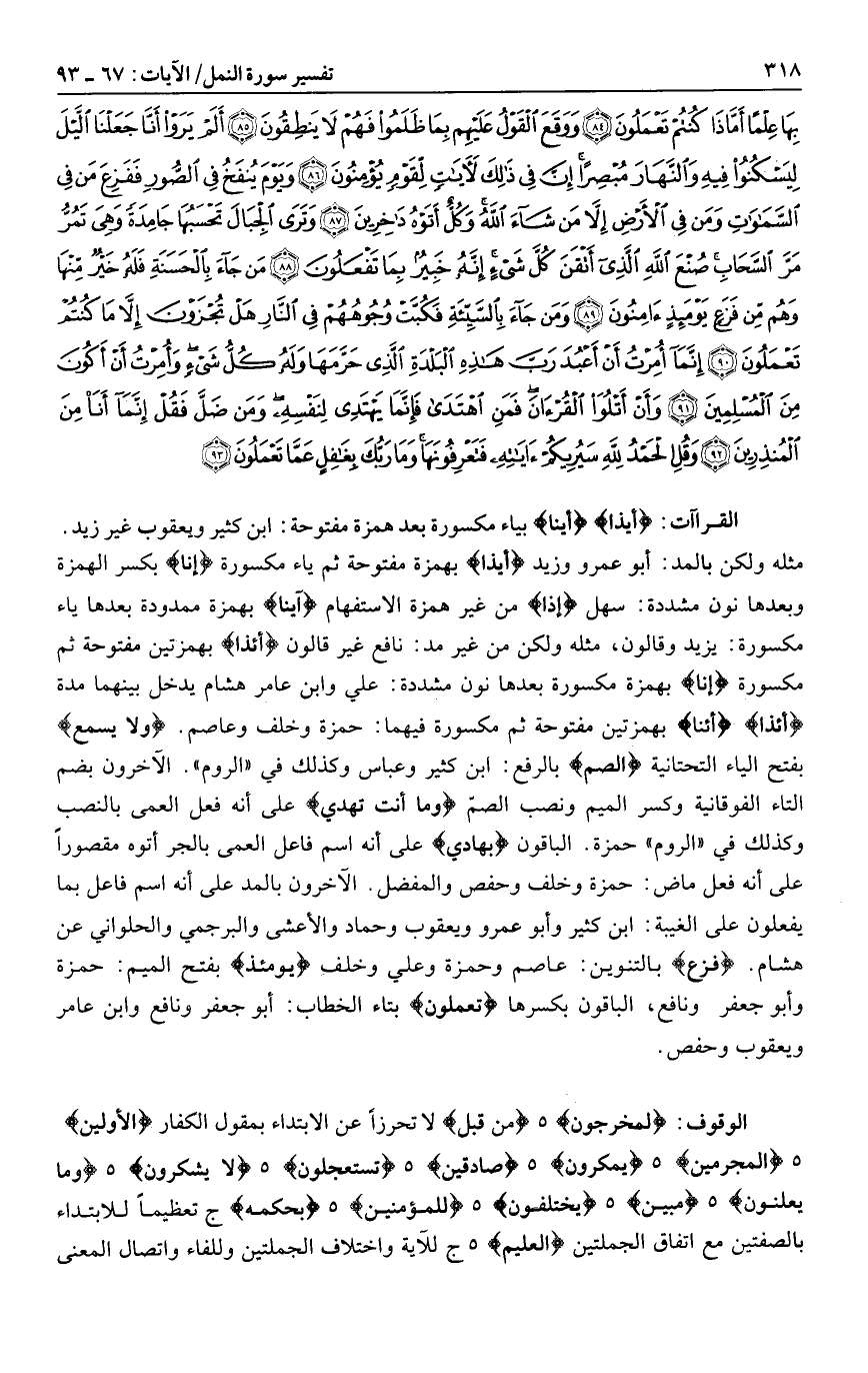 مثله ولكن بالمد: أبو عمرو وزيد أيذا بهمزة مفتوحة ثم ياء مكسورة إِنَّا بكسر الهمزة وبعدها نون مشددة: سهل إِذا من غير همزة الاستفهام آينا بهمزة ممدودة بعدها ياء مكسورة: يزيد وقالون، مثله ولكن من غير مد: نافع غير قالون أَإِذا بهمزتين مفتوحة ثم مكسورة إِنَّا بهمزة مكسورة بعدها نون مشددة: علي وابن عامر هشام يدخل بينهما مدة أَإِذا أَإِنَّا بهمزتين مفتوحة ثم مكسورة فيهما: حمزة وخلف وعاصم. ولا يسمع بفتح الياء التحتانية الصُّمَّ بالرفع: ابن كثير وعباس وكذلك في «الروم» . الآخرون بضم التاء الفوقانية وكسر الميم ونصب الصمّ وما أنت تهدي على أنه فعل العمى بالنصب وكذلك في «الروم» حمزة. الباقون بِهادِي على أنه اسم فاعل العمى بالجر أتوه مقصورا على أنه فعل ماض: حمزة وخلف وحفص والمفضل. الآخرون بالمد على أنه اسم فاعل بما يفعلون على الغيبة: ابن كثير وأبو عمرو ويعقوب وحماد والأعشى والبرجمي والحلواني عن هشام. فَزَعٍ بالتنوين: عاصم وحمزة وعلي وخلف يَوْمَئِذٍ بفتح الميم: حمزة وأبو جعفر ونافع، الباقون بكسرها تَعْمَلُونَ بتاء الخطاب: أبو جعفر ونافع وابن عامر ويعقوب وحفص.