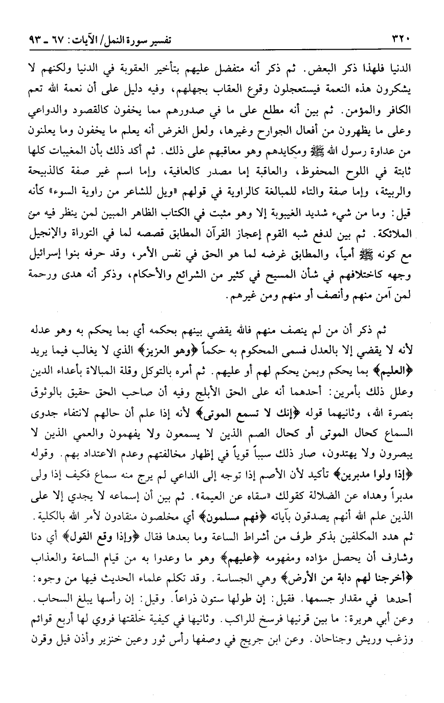 ثم ذكر أن من لم ينصف منهم فالله يقضي بينهم بحكمه أي بما يحكم به وهو عدله لأنه لا يقضي إلا بالعدل فسمى المحكوم به حكما وَهُوَ الْعَزِيزُ الذي لا يغالب فيما يريد الْعَلِيمُ بما يحكم وبمن يحكم لهم أو عليهم. ثم أمره بالتوكل وقلة المبالاة بأعداء الدين وعلل ذلك بأمرين: أحدهما أنه على الحق الأبلج وفيه أن صاحب الحق حقيق بالوثوق بنصرة الله، وثانيهما قوله إِنَّكَ لا تُسْمِعُ الْمَوْتى لأنه إذا علم أن حالهم لانتفاء جدوى السماع كحال الموتى أو كحال الصم الذين لا يسمعون ولا يفهمون والعمي الذين لا يبصرون ولا يهتدون، صار ذلك سببا قويا في إظهار مخالفتهم وعدم الاعتداد بهم. وقوله إِذا وَلَّوْا مُدْبِرِينَ تأكيد لأن الأصم إذا توجه إلى الداعي لم يرج منه سماع فكيف إذا ولى مدبرا وهداه عن الضلالة كقولك «سقاه عن العمية» . ثم بين أن إسماعه لا يجدي إلا على الذين علم الله أنهم يصدقون بآياته فَهُمْ مُسْلِمُونَ أي مخلصون منقادون لأمر الله بالكلية.