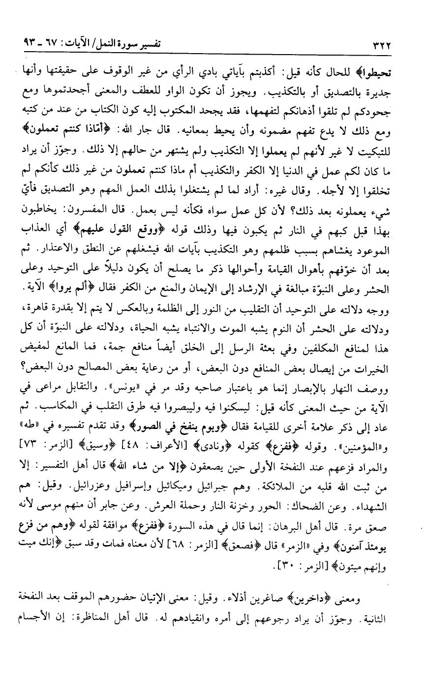 ووصف النهار بالإبصار إنما هو باعتبار صاحبه وقد مر في «يونس» . والتقابل مراعى في الآية من حيث المعنى كأنه قيل: ليسكنوا فيه وليبصروا فيه طرق التقلب في المكاسب. ثم عاد إلى ذكر علامة أخرى للقيامة فقال وَيَوْمَ يُنْفَخُ فِي الصُّورِ وقد تقدم تفسيره في «طه» و «المؤمنين» . وقوله فَفَزِعَ كقوله وَنادى [الأعراف: 48] وَسِيقَ [الزمر: 73] والمراد فزعهم عند النفخة الأولى حين يصعقون إِلَّا مَنْ شاءَ اللَّهُ قال أهل التفسير: إلا من ثبت الله قلبه من الملائكة. وهم جبرائيل وميكائيل وإسرافيل وعزرائيل. وقيل: هم الشهداء. وعن الضحاك: الحور وخزنة النار وحملة العرش. وعن جابر أن منهم موسى لأنه صعق مرة. قال أهل البرهان: إنما قال في هذه السورة فَفَزِعَ موافقة لقوله وَهُمْ مِنْ فَزَعٍ يَوْمَئِذٍ آمِنُونَ وفي «الزمر» قال فَصَعِقَ [الزمر: 68] لأن معناه فمات وقد سبق إِنَّكَ مَيِّتٌ وَإِنَّهُمْ مَيِّتُونَ [الزمر: 30] .