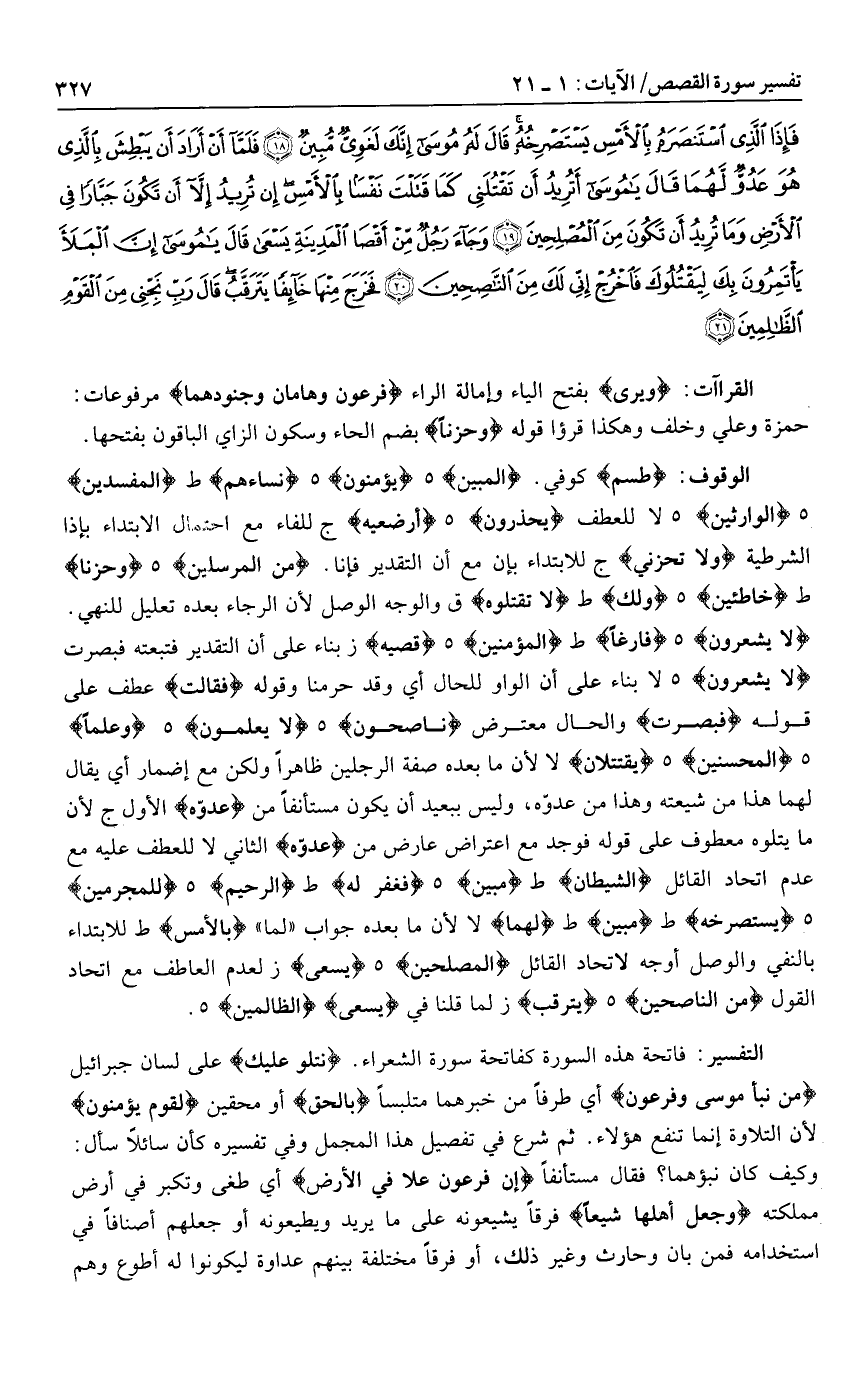 لا يَشْعُرُونَ هـ فارِغاً ط الْمُؤْمِنِينَ هـ قُصِّيهِ ز بناء على أن التقدير فتبعته فبصرت لا يَشْعُرُونَ هـ لا بناء على أن الواو للحال أي وقد حرمنا وقوله فَقالَتْ عطف على قوله فَبَصُرَتْ والحال معترض ناصِحُونَ هـ لا يَعْلَمُونَ هـ وَعِلْماً هـ الْمُحْسِنِينَ هـ يَقْتَتِلانِ لا لأن ما بعده صفة الرجلين ظاهرا ولكن مع إضمار أي يقال لهما هذا من شيعته وهذا من عدوّه، وليس ببعيد أن يكون مستأنفا من عَدُوِّهِ الأول ج لأن ما يتلوه معطوف على قوله فوجد مع اعتراض عارض من عَدُوِّهِ الثاني لا للعطف عليه مع عدم اتحاد القائل الشَّيْطانِ ط مُبِينٌ هـ فَغَفَرَ لَهُ ط الرَّحِيمُ هـ لِلْمُجْرِمِينَ هـ يَسْتَصْرِخُهُ ط مُبِينٌ ط لَهُما لا لأن ما بعده جواب «لما» بِالْأَمْسِ ط للابتداء بالنفي والوصل أوجه لاتحاد القائل الْمُصْلِحِينَ هـ يَسْعى ز لعدم العاطف مع اتحاد القول مِنَ النَّاصِحِينَ هـ يَتَرَقَّبُ ز لما قلنا في يَسْعى الظَّالِمِينَ هـ.