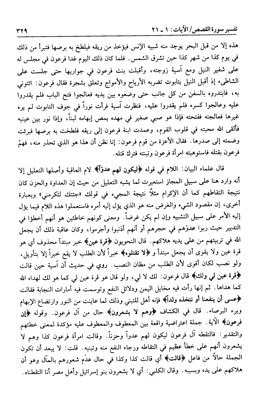 قال علماء البيان: اللام في قوله لِيَكُونَ لَهُمْ عَدُوًّا لام العاقبة وأصلها التعليل إلا أنه وارد هنا على سبيل المجاز استعيرت لما يشبه التعليل من حيث إن العداوة والحزن كان نتيجة التقاطهم كما أن الإكرام مثلا نتيجة المجيء في قولك «جئتك لتكرمني» وبعبارة أخرى، إن مقصود الشيء والغرض منه هو الذي يؤل إليه أمره فاستعملوه هذه اللام فيما يؤل إليه الأمر على سبيل التشبيه وإن لم يكن غرضا. ومعنى كونهم خاطئين هو أنهم أخطؤا في التدبير حيث ربوا عدوّهم في حجرهم أو أنهم أذنبوا وأجرموا، وكان عاقبة ذلك أن يجعل الله في تربيتهم من على يديه هلاكهم. قال النحويون قُرَّتُ عَيْنٍ خبر مبتدأ محذوف أي هو قرة عين ولا يقوى أن يجعل مبتدأ ولا تَقْتُلُوهُ خبرا لأن الطلب لا يقع خبرا إلا بتأويل، ولو نصب لكان أقوى لأن الطلب من مظان النصب.