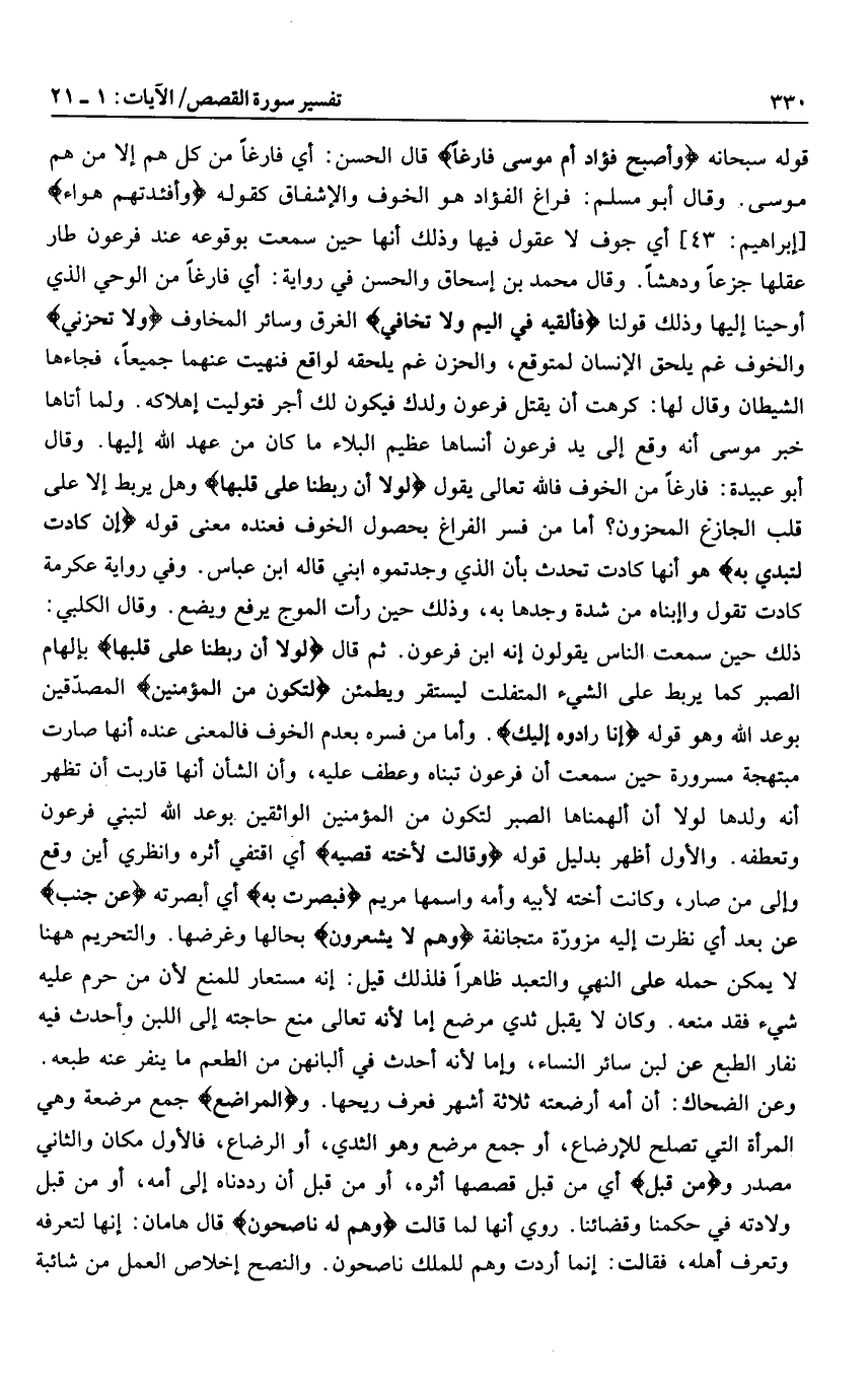 قوله سبحانه وَأَصْبَحَ فُؤادُ أُمِّ مُوسى فارِغاً قال الحسن: أي فارغا من كل هم إلا من هم موسى. وقال أبو مسلم: فراغ الفؤاد هو الخوف والإشفاق كقوله وَأَفْئِدَتُهُمْ هَواءٌ [إبراهيم: 43] أي جوف لا عقول فيها وذلك أنها حين سمعت بوقوعه عند فرعون طار عقلها جزعا ودهشا. وقال محمد بن إسحاق والحسن في رواية: أي فارغا من الوحي الذي أوحينا إليها وذلك قولنا فَأَلْقِيهِ فِي الْيَمِّ وَلا تَخافِي الغرق وسائر المخاوف وَلا تَحْزَنِي والخوف غم يلحق الإنسان لمتوقع، والحزن غم يلحقه لواقع فنهيت عنهما جميعا، فجاءها الشيطان وقال لها: كرهت أن يقتل فرعون ولدك فيكون لك أجر فتوليت إهلاكه. ولما أتاها خبر موسى أنه وقع إلى يد فرعون أنساها عظيم البلاء ما كان من عهد الله إليها. وقال أبو عبيدة: فارغا من الخوف فالله تعالى يقول لَوْلا أَنْ رَبَطْنا عَلى قَلْبِها وهل يربط إلا على قلب الجازع المحزون؟ أما من فسر الفراغ بحصول الخوف فعنده معنى قوله إِنْ كادَتْ لَتُبْدِي بِهِ هو أنها كادت تحدث بأن الذي وجدتموه ابني قاله ابن عباس. وفي رواية عكرمة كادت تقول وابناه من شدة وجدها به، وذلك حين رأت الموج يرفع ويضع. وقال الكلبي:
