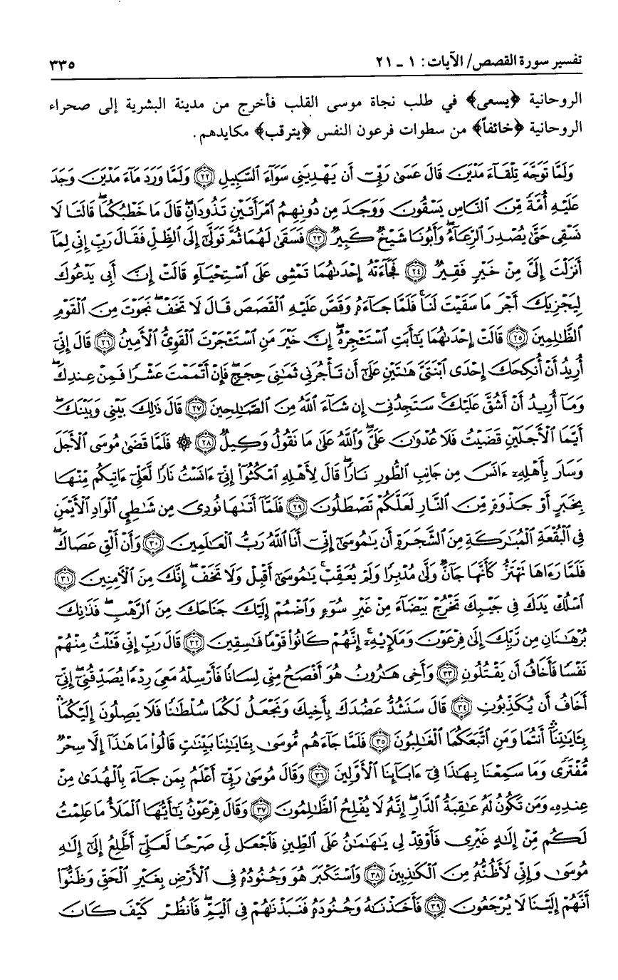 وَلَمَّا تَوَجَّهَ تِلْقاءَ مَدْيَنَ قالَ عَسى رَبِّي أَنْ يَهْدِيَنِي سَواءَ السَّبِيلِ (22) وَلَمَّا وَرَدَ ماءَ مَدْيَنَ وَجَدَ عَلَيْهِ أُمَّةً مِنَ النَّاسِ يَسْقُونَ وَوَجَدَ مِنْ دُونِهِمُ امْرَأَتَيْنِ تَذُودانِ قالَ ما خَطْبُكُما قالَتا لا نَسْقِي حَتَّى يُصْدِرَ الرِّعاءُ وَأَبُونا شَيْخٌ كَبِيرٌ (23) فَسَقى لَهُما ثُمَّ تَوَلَّى إِلَى الظِّلِّ فَقالَ رَبِّ إِنِّي لِما أَنْزَلْتَ إِلَيَّ مِنْ خَيْرٍ فَقِيرٌ (24) فَجاءَتْهُ إِحْداهُما تَمْشِي عَلَى اسْتِحْياءٍ قالَتْ إِنَّ أَبِي يَدْعُوكَ لِيَجْزِيَكَ أَجْرَ ما سَقَيْتَ لَنا فَلَمَّا جاءَهُ وَقَصَّ عَلَيْهِ الْقَصَصَ قالَ لا تَخَفْ نَجَوْتَ مِنَ الْقَوْمِ الظَّالِمِينَ (25) قالَتْ إِحْداهُما يا أَبَتِ اسْتَأْجِرْهُ إِنَّ خَيْرَ مَنِ اسْتَأْجَرْتَ الْقَوِيُّ الْأَمِينُ (26)