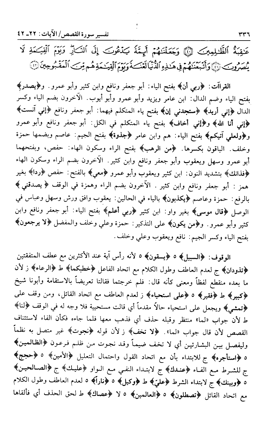 السَّبِيلِ هـ يَسْقُونَ هـ لأنه رأس آية عند الأكثرين مع عطف المتفقتين تَذُودانِ ج لعدم العاطف وطول الكلام مع اتحاد الفاعل خَطْبُكُما ط الرِّعاءُ ز لأن ما بعده منقطع لفظا ومعنى كأنه قال: فلم خرجتما فقالتا تعريضا بالاستقامة وأبونا شيخ كَبِيرٌ ط فَقِيرٌ هـ عَلَى اسْتِحْياءٍ ز لعدم العاطف مع اتحاد القائل، ومن وقف على تَمْشِي ويجعل على استحياء حالا مقدما أي قالت مستحيية فلا وجه له في الوقف لَنا ط لأن جواب «لما» منتظر وقبله حذف أي فذهب معها فلما جاءه فكأن الفاء لاستئناف القصص لأن قال جواب «لما» . لا تَخَفْ ز لأن قوله نَجَوْتَ غير متصل به نظما وليفصل بين البشارتين أي لا تخف ضيما وقد نجوت من ظلم فرعون الظَّالِمِينَ هـ اسْتَأْجِرْهُ ج للابتداء بأن مع اتحاد القول واحتمال التعليل الْأَمِينُ هـ حِجَجٍ ج للشرط مع الفاء عِنْدِكَ ج لابتداء النفي مع الواو عَلَيْكَ ج الصَّالِحِينَ هـ وَبَيْنَكَ ج لابتداء الشرط عَلَيَّ ط وَكِيلٌ هـ ناراً هـ لعدم العاطف وطول الكلام مع اتحاد القائل تَصْطَلُونَ هـ الْعالَمِينَ هـ لا عَصاكَ ط لحق الحذف أي فألقاها