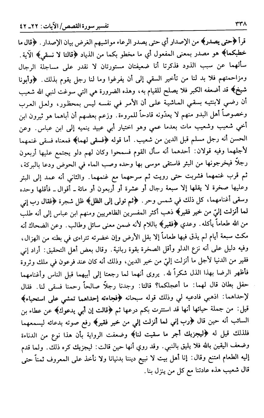 سألهما عن سبب الذود فذكرتا أنا ضعيفتان مستورتان لا نقدر على مساجلة الرجال ومزاحمتهم فلا بد لنا من تأخير السقي إلى أن يفرغوا وما لنا رجل يقوم بذلك. وَأَبُونا شَيْخٌ قد أضعفه الكبر فلا يصلح للقيام به، وهذه الضرورة هي التي سوغت لنبي الله شعيب أن رضي لابنتيه بسقي الماشية على أن الأمر في نفسه ليس بمحظور، ولعل العرب وخصوصا أهل البدو منهم لا يعدّونه قادحا للمروءة. وزعم بعضهم أن أباهما هو ثيرون ابن أخي شعيب وشعيب مات بعد ما عمي وهو اختيار أبي عبيد ينميه إلى ابن عباس. وعن الحسن أنه رجل مسلم قبل الدين من شعيب. أما قوله فَسَقى لَهُما فمعناه فسقى غنمهما لأجلهما وفيه قولان: أحدهما أنه سأل القوم فسمحوا وكان لهم دلو يجتمع عليها أربعون رجلا فيخرجونها من البئر فاستقى موسى بها وحده وصب الماء في الحوض ودعا بالبركة، ثم قرب غنمهما فشربت حتى رويت ثم سرحهما مع غنمهما. والثاني أنه عمد إلى البئر وعليها صخرة لا يقلها إلا سبعة رجال أو عشرة أو أربعون أو مائة- أقوال- فأقلها وحده وسقى أغنامهما، كل ذلك في شمس وحر. ثُمَّ تَوَلَّى إِلَى الظِّلِّ ظل شجرة فَقالَ رَبِّ إِنِّي لِما أَنْزَلْتَ إِلَيَّ مِنْ خَيْرٍ فَقِيرٌ ذهب أكثر المفسرين الظاهريين ومنهم ابن عباس إلى أنه طلب من الله طعاما يأكله. وعدي فَقِيرٌ باللام لأنه ضمن معنى سائل وطالب. وعن الضحاك أنه مكث سبعة أيام لم يذق فيها طعاما إلا بقل الأرض وإن خضرته تتراءى في بطنه من الهزال، وفيه دليل على أنه نزع الدلو وأقل الصخرة بقوة ربانية. وقال بعض أهل التحقيق: أراد إني فقير من الدنيا لأجل ما أنزلت إليّ من خير الدين، وذلك أنه كان عند فرعون في ملك وثروة فأظهر الرضا بهذا الذل شكرا لله.