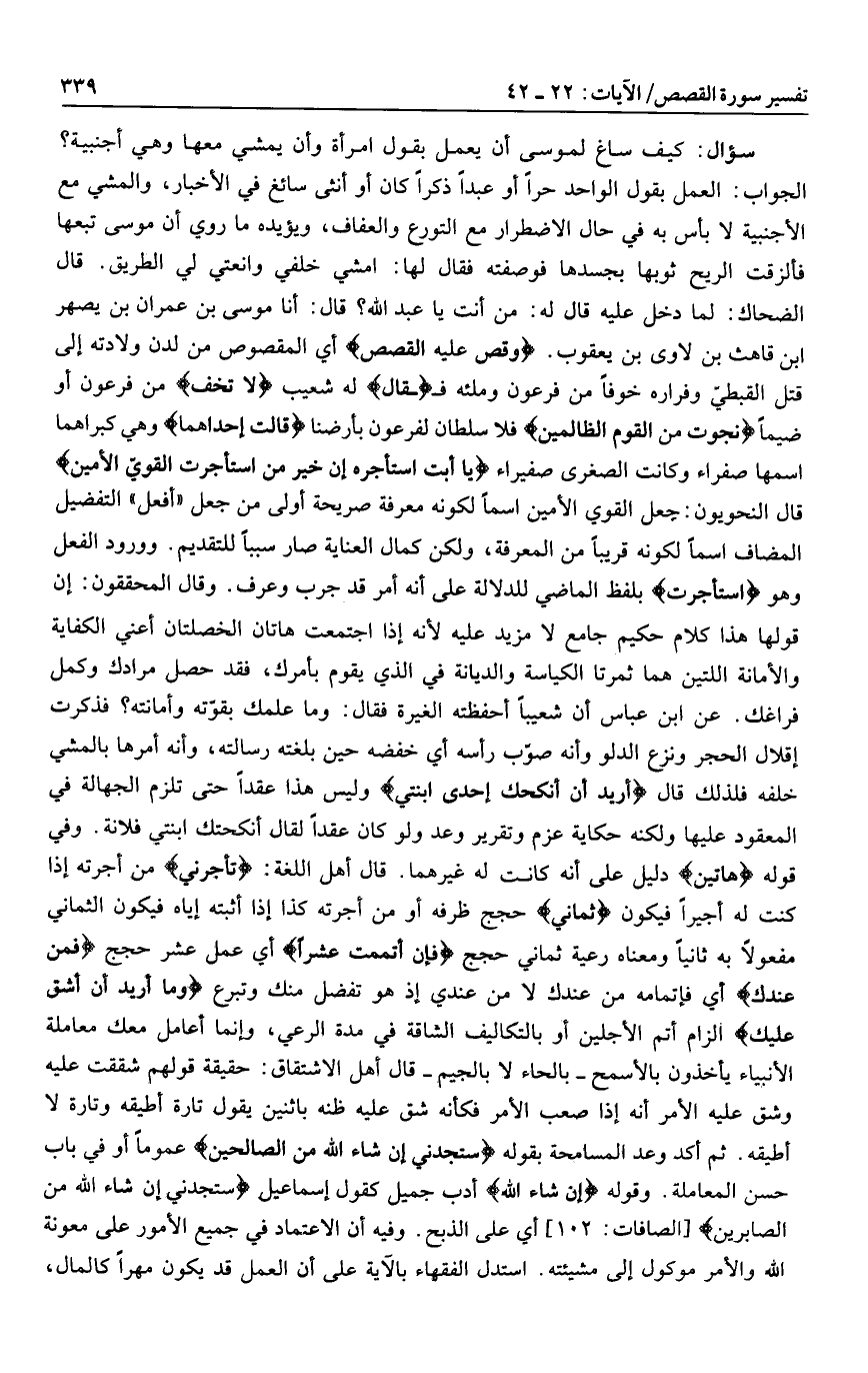 وَقَصَّ عَلَيْهِ الْقَصَصَ أي المقصوص من لدن ولادته إلى قتل القبطيّ وفراره خوفا من فرعون وملئه ف قالَ له شعيب لا تَخَفْ من فرعون أو ضيما نَجَوْتَ مِنَ الْقَوْمِ الظَّالِمِينَ فلا سلطان لفرعون بأرضنا قالَتْ إِحْداهُما وهي كبراهما اسمها صفراء وكانت الصغرى صفيراء يا أَبَتِ اسْتَأْجِرْهُ إِنَّ خَيْرَ مَنِ اسْتَأْجَرْتَ الْقَوِيُّ الْأَمِينُ قال النحويون: جعل القوي الأمين اسما لكونه معرفة صريحة أولى من جعل «أفعل» التفضيل المضاف اسما لكونه قريبا من المعرفة، ولكن كمال العناية صار سببا للتقديم. وورود الفعل وهو اسْتَأْجَرْتَ بلفظ الماضي للدلالة على أنه أمر قد جرب وعرف. وقال المحققون: إن قولها هذا كلام حكيم جامع لا مزيد عليه لأنه إذا اجتمعت هاتان الخصلتان أعني الكفاية والأمانة اللتين هما ثمرتا الكياسة والديانة في الذي يقوم بأمرك، فقد حصل مرادك وكمل فراغك. عن ابن عباس أن شعيبا أحفظته الغيرة فقال: وما علمك بقوّته وأمانته؟ فذكرت إقلال الحجر ونزع الدلو وأنه صوّب رأسه أي خفضه حين بلغته رسالته، وأنه أمرها بالمشي خلفه فلذلك قال أُرِيدُ أَنْ أُنْكِحَكَ إِحْدَى ابْنَتَيَّ وليس هذا عقدا حتى تلزم الجهالة في المعقود عليها ولكنه حكاية عزم وتقرير وعد ولو كان عقدا لقال أنكحتك ابنتي فلانة. وفي قوله هاتَيْنِ دليل على أنه كانت له غيرهما. قال أهل اللغة: تَأْجُرَنِي من أجرته إذا كنت له أجيرا فيكون ثَمانِيَ حجج ظرفه أو من أجرته كذا إذا أثبته إياه فيكون الثماني مفعولا به ثانيا ومعناه رعية ثماني حجج فَإِنْ أَتْمَمْتَ عَشْراً أي عمل عشر حجج فَمِنْ عِنْدِكَ أي فإتمامه من عندك لا من عندي إذ هو تفضل منك وتبرع وَما أُرِيدُ أَنْ أَشُقَّ عَلَيْكَ الزام أتم الأجلين أو بالتكاليف الشاقة في مدة الرعي، وإنما أعامل معك معاملة الأنبياء يأخذون بالأسمح- بالحاء لا بالجيم- قال أهل الاشتقاق: حقيقة قولهم شققت عليه وشق عليه الأمر أنه إذا صعب الأمر فكأنه شق عليه ظنه باثنين يقول تارة أطيقه وتارة لا أطيقه. ثم أكد وعد المسامحة بقوله سَتَجِدُنِي إِنْ شاءَ اللَّهُ مِنَ الصَّالِحِينَ عموما أو في باب حسن المعاملة. وقوله إِنْ شاءَ اللَّهُ أدب جميل كقول إسماعيل سَتَجِدُنِي إِنْ شاءَ اللَّهُ مِنَ الصَّابِرِينَ [الصافات: 102] أي على الذبح. وفيه أن الاعتماد في جميع الأمور على معونة الله والأمر موكول إلى مشيئته. استدل الفقهاء بالآية على أن العمل قد يكون مهرا كالمال،