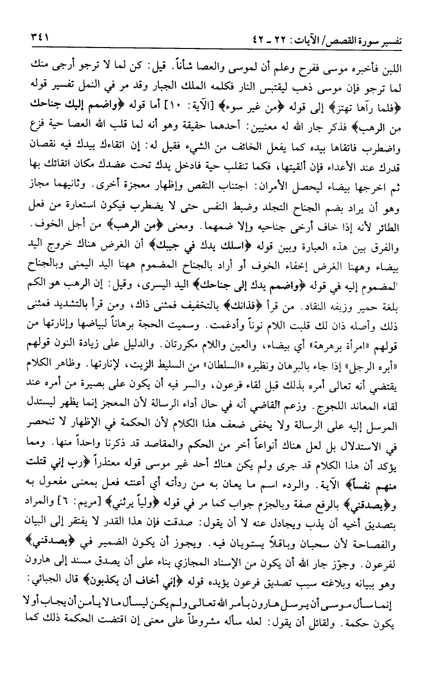 والفرق بين هذه العبارة وبين قوله اسْلُكْ يَدَكَ فِي جَيْبِكَ أن الغرض هناك خروج اليد بيضاء وهاهنا الغرض إخفاء الخوف أو أراد بالجناح المضموم هاهنا اليد اليمنى وبالجناح المضموم إليه في قوله وَاضْمُمْ يَدَكَ إِلى جَناحِكَ اليد اليسرى، وقيل: إن الرهب هو الكم بلغة حمير وزيفه النقاد. من قرأ فَذانِكَ بالتخفيف فمثنى ذاك، ومن قرأ بالتشديد فمثنى ذلك وأصله ذان لك قلبت اللام نونا وأدغمت. وسميت الحجة برهانا لبياضها وإنارتها من قولهم «امرأة برهرهة» أي بيضاء، والعين واللام مكررتان. والدليل على زيادة النون قولهم «أبره الرجل» إذا جاء بالبرهان ونظيره «السلطان» من السليط الزيت، لإنارتها. وظاهر الكلام يقتضي أنه تعالى أمره بذلك قبل لقاء فرعون، والسر فيه أن يكون على بصيرة من أمره عند لقاء المعاند اللجوج. وزعم القاضي أنه في حال أداء الرسالة لأن المعجز إنما يظهر ليستدل المرسل إليه على الرسالة ولا يخفى ضعف هذا الكلام لأن الحكمة في الإظهار لا تنحصر في الاستدلال بل لعل هناك أنواعا أخر من الحكم والمقاصد قد ذكرنا واحدا منها. ومما يؤكد أن هذا الكلام قد جرى ولم يكن هناك أحد غير موسى قوله معتذرا رَبِّ إِنِّي قَتَلْتُ مِنْهُمْ نَفْساً الآية. والردء اسم ما يعان به من ردأته أي أعنته فعل بمعنى مفعول به ويُصَدِّقُنِي بالرفع صفة وبالجزم جواب كما مر في قوله وَلِيًّا يَرِثُنِي [مريم: 6] والمراد بتصديق أخيه أن يذب ويجادل عنه لا أن يقول: صدقت فإن هذا القدر لا يفتقر إلى البيان والفصاحة لأن سحبان وباقلا يستويان فيه. ويجوز أن يكون الضمير في يُصَدِّقُنِي لفرعون. وجوّز جار الله أن يكون من الإسناد المجازي بناء على أن يصدق مسند إلى هارون وهو ببيانه وبلاغته سبب تصديق فرعون يؤيده قوله إِنِّي أَخافُ أَنْ يُكَذِّبُونِ قال الجبائي: