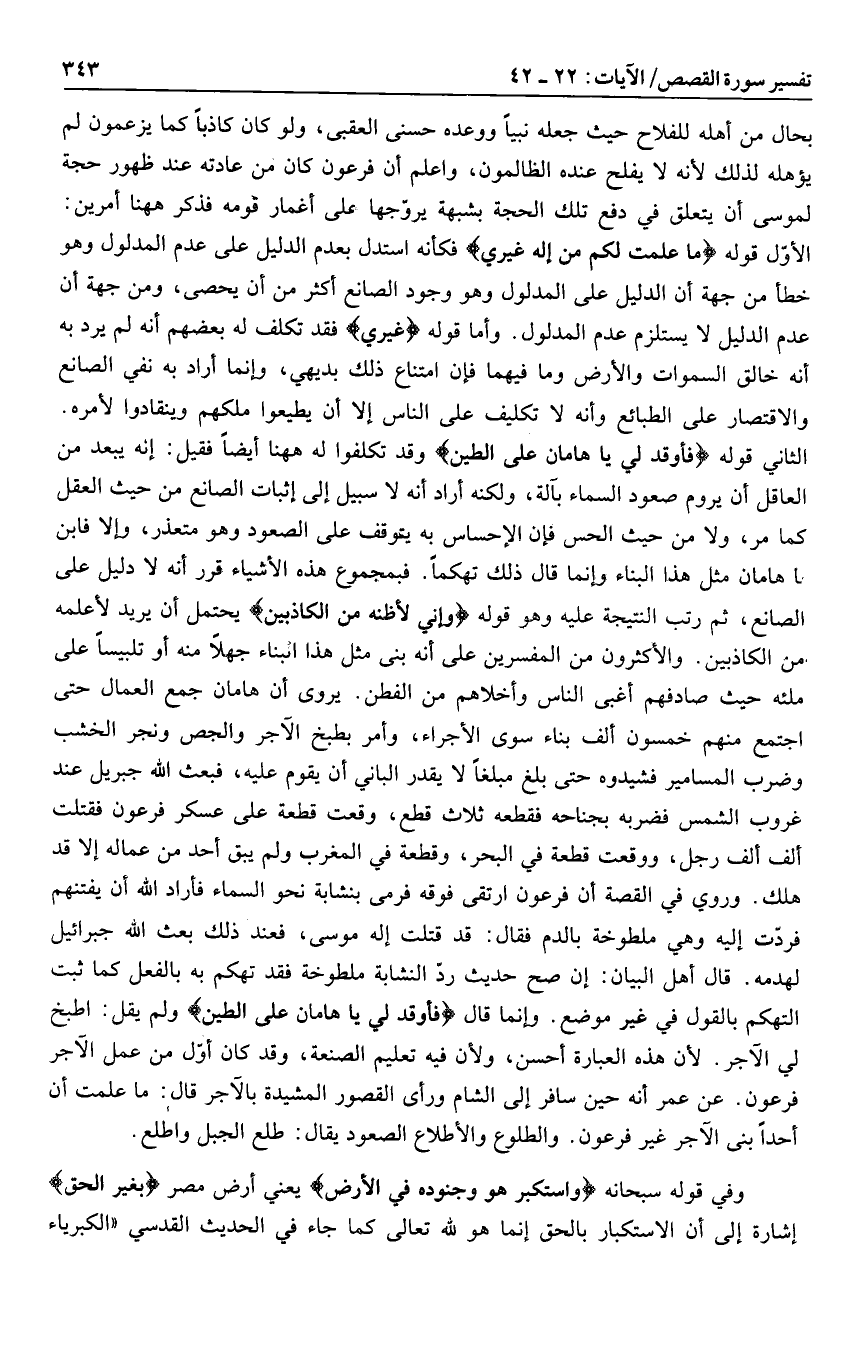 الثاني قوله فَأَوْقِدْ لِي يا هامانُ عَلَى الطِّينِ وقد تكلفوا له هاهنا أيضا فقيل: إنه يبعد من العاقل أن يروم صعود السماء بآلة، ولكنه أراد أنه لا سبيل إلى إثبات الصانع من حيث العقل كما مر، ولا من حيث الحس فإن الإحساس به يتوقف على الصعود وهو متعذر، وإلا فابن يا هامان مثل هذا البناء وإنما قال ذلك تهكما. فبمجموع هذه الأشياء قرر أنه لا دليل على الصانع، ثم رتب النتيجة عليه وهو قوله وَإِنِّي لَأَظُنُّهُ مِنَ الْكاذِبِينَ يحتمل أن يريد لأعلمه من الكاذبين. والأكثرون من المفسرين على أنه بنى مثل هذا البناء جهلا منه أو تلبيسا على ملئه حيث صادفهم أغبى الناس وأخلاهم من الفطن.