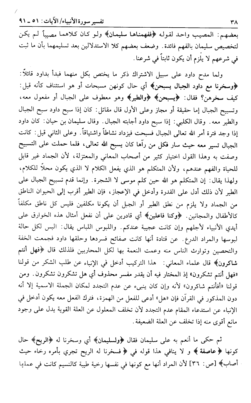 كيف سخرهن؟ فقال: يُسَبِّحْنَ وَالطَّيْرَ وهو معطوف على الجبال أو مفعول معه، وتسبيح الجبال إما حقيقة أو مجاز وعلى الأول قال مقاتل: كان إذا سبح داود سبح الجبال والطير معه. وقال الكلبي: إذا سبح داود أجابته الجبال. وقال سليمان بن حيان: كان داود إذا وجد فترة أمر الله تعالى الجبال فسبحت فيزداد نشاطا واشتياقا. وعلى الثاني قيل: كانت الجبال تسير معه حيث سار فكل من رآها كان يسبح الله تعالى، فلما حملت على التسبيح وصفت به وهذا القول اختيار كثير من أصحاب المعاني والمعتزلة، لأن الجماد غير قابل للحياة والفهم عندهم، ولأن المتكلم هو الذي يفعل الكلام لا الذي يكون محلا للكلام، ولهذا يقال: إن المتكلم هو الله حين كلم موسى لا الشجرة. وإنما قدم تسبيح الجبال على الطير لأن ذلك أدل على القدرة وأدخل في الإعجاز، فإن الطير أقرب إلى الحيوان الناطق من الجماد ولا يلزم من نطق الطير أو الجبل أن يكونا مكلفين فليس كل ناطق مكلفا كالأطفال والمجانين. وَكُنَّا فاعِلِينَ أي قادرين على أن نفعل أمثال هذه الخوارق على أيدي الأنبياء لأجلهم وإن كانت عجيبة عندكم. واللبوس اللباس يقال: البس لكل حالة لبوسها والمراد الدرع. عن قتادة أنها كانت صفائح فسردها وحلقها داود فجمعت الخفة والتحصين وتوارث الناس منه وعمت النعمة بها لكل المحاربين فلذلك قال فَهَلْ أَنْتُمْ شاكِرُونَ قال علماء المعاني: هذا التركيب أدخل في الإنباء عن طلب الشكر من قولنا «فهل أنتم تشكرون» إذ المختار فيه أن يقدر مفسر محذوف أي هل تشكرون تشكرون. ومن قولنا «أفأنتم شاكرون» لأنه وإن كان ينبىء عن عدم التجدد لمكان الجملة الاسمية إلا أنه دون المذكور في القرآن فإن «هل» أدعى للفعل من الهمزة، فترك الفعل معه يكون أدخل في الإنباء عن استدعاء المقام عدم التجدد لأن تخلف المعلول عن العلة القوية يدل على وجود مانع أقوى منه إذا تخلف عن العلة الضعيفة.