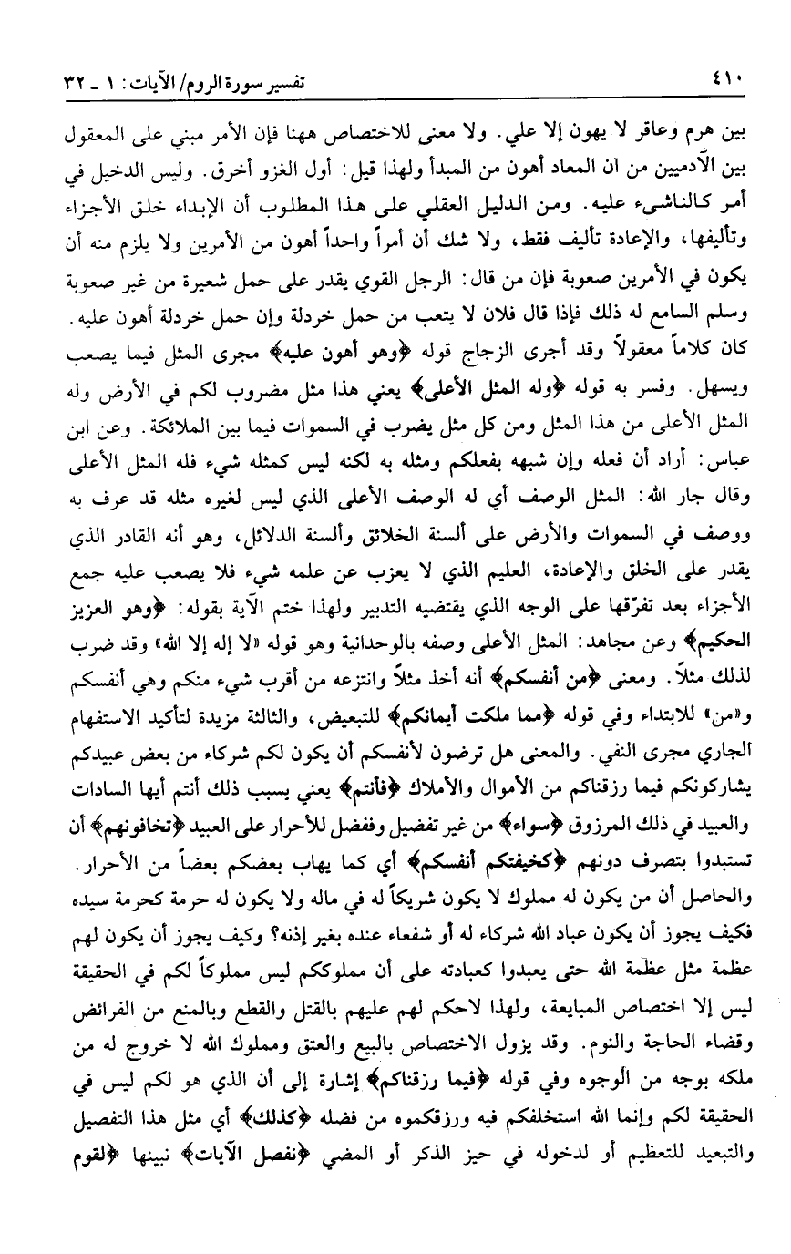 كان كلاما معقولا وقد أجرى الزجاج قوله وَهُوَ أَهْوَنُ عَلَيْهِ مجرى المثل فيما يصعب ويسهل. وفسر به قوله وَلَهُ الْمَثَلُ الْأَعْلى يعني هذا مثل مضروب لكم في الأرض وله المثل الأعلى من هذا المثل ومن كل مثل يضرب في السموات فيما بين الملائكة. وعن ابن عباس: أراد أن فعله وإن شبهه بفعلكم ومثله به لكنه ليس كمثله شيء فله المثل الأعلى وقال جار الله: المثل الوصف أي له الوصف الأعلى الذي ليس لغيره مثله قد عرف به ووصف في السموات والأرض على ألسنة الخلائق وألسنة الدلائل، وهو أنه القادر الذي يقدر على الخلق والإعادة، العليم الذي لا يعزب عن علمه شيء فلا يصعب عليه جمع الأجزاء بعد تفرّقها على الوجه الذي يقتضيه التدبير ولهذا ختم الآية بقوله: وَهُوَ الْعَزِيزُ الْحَكِيمُ وعن مجاهد: المثل الأعلى وصفه بالوحدانية وهو قوله «لا إله إلا الله» وقد ضرب لذلك مثلا. ومعنى مِنْ أَنْفُسِكُمْ أنه أخذ مثلا وانتزعه من أقرب شيء منكم وهي أنفسكم و «من» للابتداء وفي قوله مِمَّا مَلَكَتْ أَيْمانُكُمْ للتبعيض، والثالثة مزيدة لتأكيد الاستفهام الجاري مجرى النفي. والمعنى هل ترضون لأنفسكم أن يكون لكم شركاء من بعض عبيدكم يشاركونكم فيما رزقناكم من الأموال والأملاك فَأَنْتُمْ يعني بسبب ذلك أنتم أيها السادات والعبيد في ذلك المرزوق سَواءٌ من غير تفضيل وففضل للأحرار على العبيد تَخافُونَهُمْ أن تستبدوا بتصرف دونهم كَخِيفَتِكُمْ أَنْفُسَكُمْ أي كما يهاب بعضكم بعضا من الأحرار.