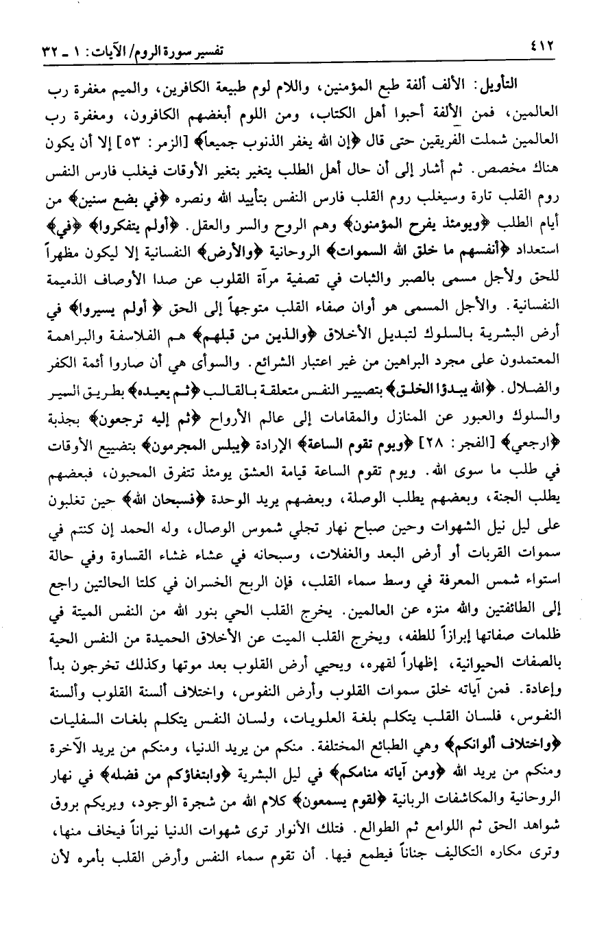 الألف ألفة طبع المؤمنين، واللام لوم طبيعة الكافرين، والميم مغفرة رب العالمين، فمن الألفة أحبوا أهل الكتاب، ومن اللوم أبغضهم الكافرون، ومغفرة رب العالمين شملت الفريقين حتى قال إِنَّ اللَّهَ يَغْفِرُ الذُّنُوبَ جَمِيعاً [الزمر: 53] إلا أن يكون هناك مخصص. ثم أشار إلى أن حال أهل الطلب يتغير بتغير الأوقات فيغلب فارس النفس روم القلب تارة وسيغلب روم القلب فارس النفس بتأييد الله ونصره فِي بِضْعِ سِنِينَ من أيام الطلب وَيَوْمَئِذٍ يَفْرَحُ الْمُؤْمِنُونَ وهم الروح والسر والعقل. أَوَلَمْ يَتَفَكَّرُوا فِي استعداد أَنْفُسِهِمْ ما خَلَقَ اللَّهُ السَّماواتِ الروحانية وَالْأَرْضَ النفسانية إلا ليكون مظهرا للحق ولأجل مسمى بالصبر والثبات في تصفية مرآة القلوب عن صدا الأوصاف الذميمة النفسانية. والأجل المسمى هو أوان صفاء القلب متوجها إلى الحق أَوَلَمْ يَسِيرُوا في أرض البشرية بالسلوك لتبديل الأخلاق والَّذِينَ مِنْ قَبْلِهِمْ هم الفلاسفة والبراهمة المعتمدون على مجرد البراهين من غير اعتبار الشرائع. والسوأى هي أن صاروا أئمة الكفر والضلال. اللَّهُ يَبْدَؤُا الْخَلْقَ بتصيير النفس متعلقة بالقالب ثُمَّ يُعِيدُهُ بطريق السير والسلوك والعبور عن المنازل والمقامات إلى عالم الأرواح ثُمَّ إِلَيْهِ تُرْجَعُونَ بجذبة ارْجِعِي [الفجر: 28] وَيَوْمَ تَقُومُ السَّاعَةُ الإرادة يُبْلِسُ الْمُجْرِمُونَ بتضييع الأوقات في طلب ما سوى الله. ويوم تقوم الساعة قيامة العشق يومئذ تتفرق المحبون، فبعضهم يطلب الجنة، وبعضهم يطلب الوصلة، وبعضهم يريد الوحدة فَسُبْحانَ اللَّهِ حين تغلبون على ليل نيل الشهوات وحين صباح نهار تجلي شموس الوصال، وله الحمد إن كنتم في سموات القربات أو أرض البعد والغفلات، وسبحانه في عشاء غشاء القساوة وفي حالة استواء شمس المعرفة في وسط سماء القلب، فإن الربح الخسران في كلتا الحالتين راجع إلى الطائفتين والله منزه عن العالمين. يخرج القلب الحي بنور الله من النفس الميتة في ظلمات صفاتها إبرازا للطفه، ويخرج القلب الميت عن الأخلاق الحميدة من النفس الحية بالصفات الحيوانية، إظهارا لقهره، ويحيي أرض القلوب بعد موتها وكذلك تخرجون بدأ وإعادة. فمن آياته خلق سموات القلوب وأرض النفوس، واختلاف ألسنة القلوب وألسنة النفوس، فلسان القلب يتكلم بلغة العلويات، ولسان النفس يتكلم بلغات السفليات واختلاف أَلْوانِكُمْ وهي الطبائع المختلفة. منكم من يريد الدنيا، ومنكم من يريد الآخرة ومنكم من يريد الله وَمِنْ آياتِهِ مَنامُكُمْ في ليل البشرية وَابْتِغاؤُكُمْ مِنْ فَضْلِهِ في نهار الروحانية والمكاشفات الربانية لِقَوْمٍ يَسْمَعُونَ كلام الله من شجرة الوجود، ويريكم بروق شواهد الحق ثم اللوامع ثم الطوالع. فتلك الأنوار ترى شهوات الدنيا نيرانا فيخاف منها، وترى مكاره التكاليف جنانا فيطمع فيها. أن تقوم سماء النفس وأرض القلب بأمره لأن