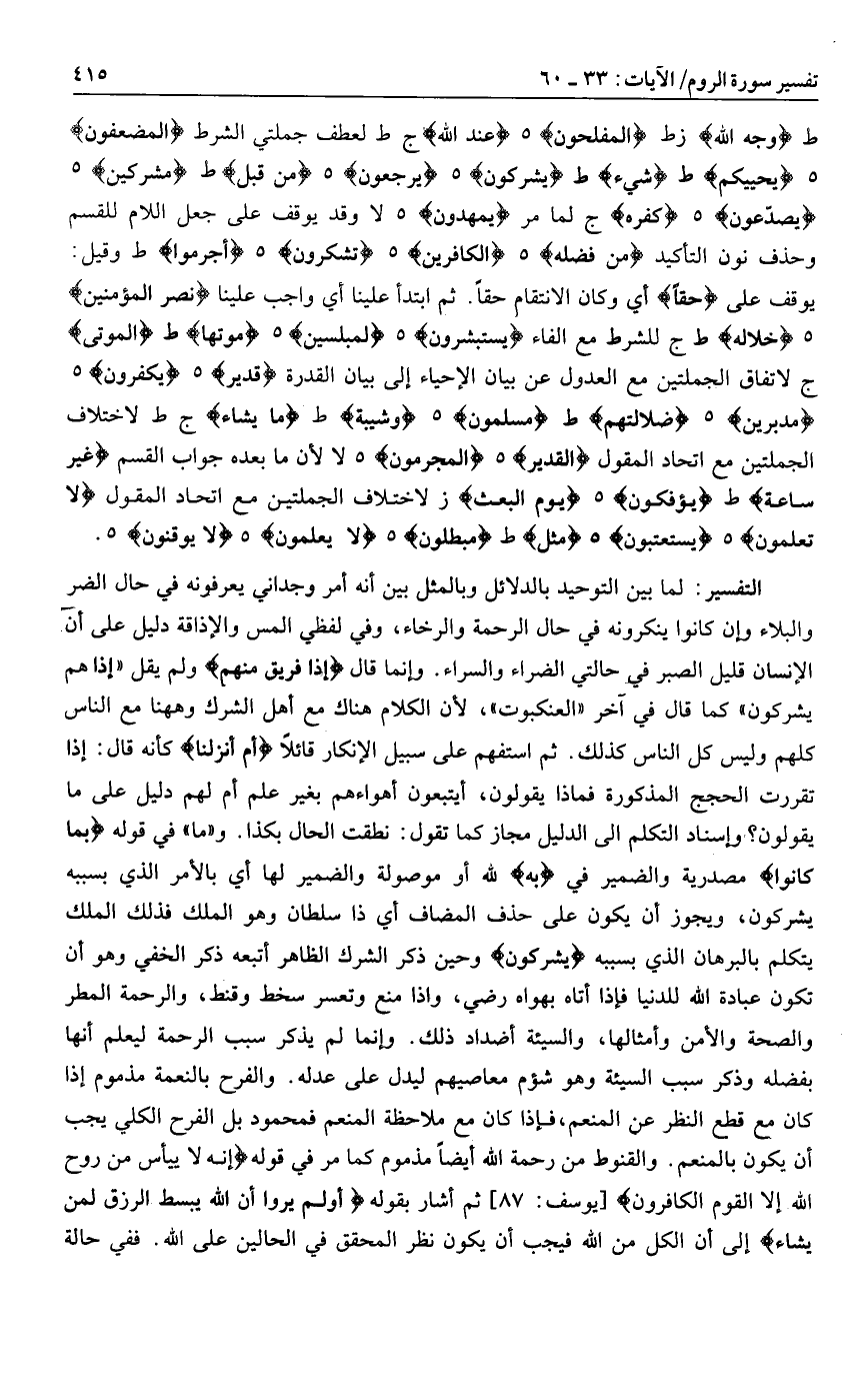 ط وَجْهَ اللَّهِ ز ط الْمُفْلِحُونَ هـ عِنْدَ اللَّهِ ج ط لعطف جملتي الشرط الْمُضْعِفُونَ هـ يُحْيِيكُمْ ط شَيْءٍ ط يُشْرِكُونَ هـ يَرْجِعُونَ هـ مِنْ قَبْلُ ط مُشْرِكِينَ هـ يَصَّدَّعُونَ هـ كُفْرُهُ ج لما مر يَمْهَدُونَ هـ لا وقد يوقف على جعل اللام للقسم وحذف نون التأكيد مِنْ فَضْلِهِ هـ الْكافِرِينَ هـ تَشْكُرُونَ هـ جْرَمُوا