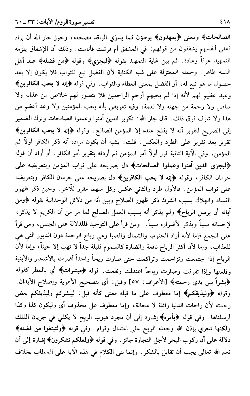 ومعنى يَمْهَدُونَ يوطؤن كما يسوّي الراقد مضجعه، وجوز جار الله أن يراد فعلى أنفسهم يشفقون من قولهم: في المشفق أم فرشت فأنامت. وذلك أن الإشفاق يلزمه التمهيد عرفا وعادة. ثم بين غاية التمهيد بقوله لِيَجْزِيَ وقوله مِنْ فَضْلِهِ عند أهل السنة ظاهر: وحمله المعتزلة على شبه الكناية لأن الفضل تبع للثواب فلا يكون إلا بعد حصول ما هو تبع له، أو الفضل بمعنى العطاء والثواب. وفي قوله إِنَّهُ لا يُحِبُّ الْكافِرِينَ وعيد عظيم لهم لأنه إذا لم يحبهم أرحم الراحمين فلا يتصور لهم خلاص من عذابه ولا مناص ولا رحمة من جهته ولا نعمة، وفيه تعريض بأنه يحب المؤمنين ولا وعد أعظم من هذا ولا شرف فوق ذلك. قال جار الله: تكرير الذين آمنوا وعملوا الصالحات وترك الضمير إلى الصريح لتقرير أنه لا يفلح عنده إلا المؤمن الصالح. وقوله إِنَّهُ لا يُحِبُّ الْكافِرِينَ تقرير بعد تقرير على الطرد والعكس. قلت: يشبه أن يكون مراده أنه ذكر الكافر أولا ثم المؤمن، وفي الآية الثانية قرر أولا أمر المؤمن ثم أردفه بتقرير أمر الكافر. أو أراد أن قوله لِيَجْزِيَ الَّذِينَ آمَنُوا وَعَمِلُوا الصَّالِحاتِ دل بصريحه على ثواب المؤمن وبتعريضه على حرمان الكافر، وقوله إِنَّهُ لا يُحِبُّ الْكافِرِينَ دل بصريحه على حرمان الكافر وبتعريضه على ثواب المؤمن. فالأول طرد والثاني عكس وكل منهما مقرر للآخر. وحين ذكر ظهور الفساد والهلاك بسبب الشرك ذكر ظهور الصلاح وبين أنه من دلائل الوحدانية بقوله وَمِنْ آياتِهِ أَنْ يُرْسِلَ الرِّياحَ ولم يذكر أنه بسبب العمل الصالح لما مر من أن الكريم لا يذكر، لإحسانه سببا ويذكر لأضراره سببا. ومن قرأ على التوحيد فللدلالة على الجنس، ومن قرأ على الجمع فإما لأنه أراد الجنوب والشمال والصبا وهي رياح الرحمة دون الدبور التي هي للعذاب، وإما لأن أكثر الرياح نافعة والضارة كالسموم قليلة جدا لا تهب إلا حينا، وإما لأن الرياح إذا اجتمعت وتزاحمت وتراكمت حتى صارت ريحا واحدا أضرت بالأشجار والأبنية وقلعتها وإذا تفرقت وصارت رياحا اعتدلت ونفعت. قوله مُبَشِّراتٍ أي بالمطر كقوله بُشْراً بَيْنَ يَدَيْ رَحْمَتِهِ [الأعراف: 57] وقيل: أي بتصحيح الأهوية وإصلاح الأبدان.