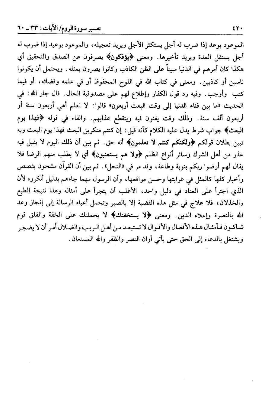 قالوا: لا نعلم أهي أربعون سنة أو أربعون ألف سنة. وذلك وقت يفنون فيه وينقطع عذابهم. والفاء في قوله فَهذا يَوْمُ الْبَعْثِ جواب شرط يدل عليه الكلام كأنه قيل: إن كنتم منكرين البعث فهذا يوم البعث وبه تبين بطلان قولكم وَلكِنَّكُمْ كُنْتُمْ لا تَعْلَمُونَ أنه حق. ثم بين أن ذلك اليوم لا يقبل فيه عذر من أهل الشرك وسائر أنواع الظلم وَلا هُمْ يُسْتَعْتَبُونَ أي لا يطلب منهم الرضا فلا يقال لهم أرضوا ربكم بتوبة وطاعة، وقد مر في «النحل» . ثم بين أن القرآن مشحون بقصص وأخبار كلها كالمثل في غرابتها وحسن مواقعها، وأن الرسول مهما جاءهم بدليل أنكروه لأن الذي اجترأ على العناد في دليل واحد، الأغلب أن يتجرأ على أمثاله وهذا نتيجة الطبع والخذلان، فلا علاج في مثل هذه القضية إلا بالصبر وتحمل أعباء الرسالة إلى إنجاز وعد الله بالنصرة وإعلاء الدين. ومعنى لا يَسْتَخِفَّنَّكَ لا يحملنك على الخفة والقلق قوم شاكون فأمثال هذه الأفعال والأقوال لا تستبعد من أهل الريب والضلال أمر أن لا يضجر ويشتغل بالدعاء إلى الحق حتى يأتي أوان النصر والظفر والله المستعان.