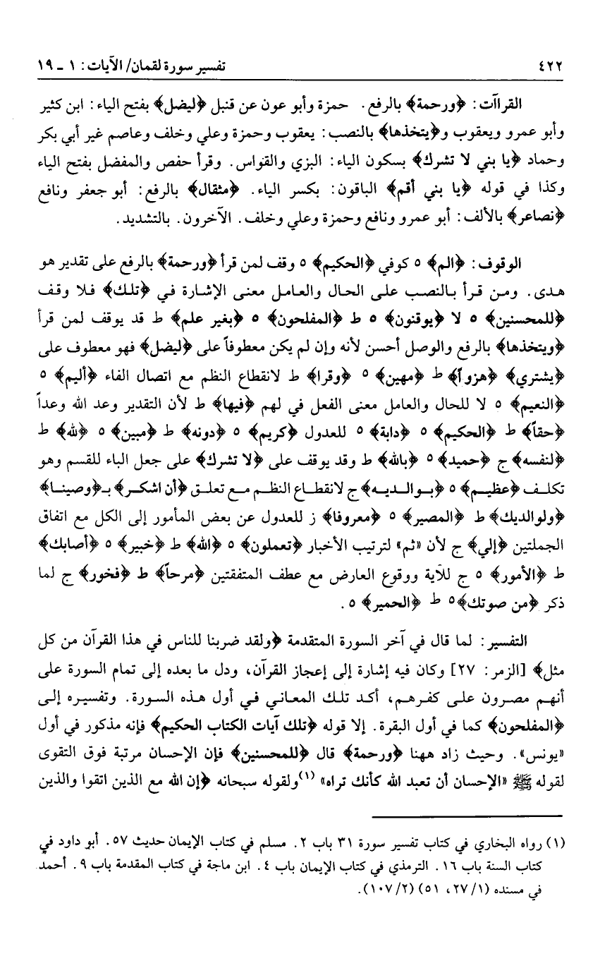 الم هـ كوفي الْحَكِيمِ هـ وقف لمن قرأ وَرَحْمَةً بالرفع على تقدير هو هدى. ومن قرأ بالنصب على الحال والعامل معنى الإشارة في تِلْكَ فلا وقف لِلْمُحْسِنِينَ هـ لا يُوقِنُونَ هـ ط الْمُفْلِحُونَ هـ بِغَيْرِ عِلْمٍ ط قد يوقف لمن قرأ وَيَتَّخِذَها بالرفع والوصل أحسن لأنه وإن لم يكن معطوفا على لِيُضِلَّ فهو معطوف على يَشْتَرِي هُزُواً ط مُهِينٌ ط وَقْراً ط لانقطاع النظم مع اتصال الفاء أَلِيمٍ هـ النَّعِيمِ هـ لا للحال والعامل معنى الفعل في لهم فِيها ط لأن التقدير وعد الله وعدا حَقًّا ط الْحَكِيمُ هـ دابَّةٍ هـ للعدول كَرِيمٍ هـ دُونِهِ ط مُبِينٍ هـ لِلَّهِ ط لِنَفْسِهِ ج حَمِيدٌ هـ بِاللَّهِ ط وقد يوقف على لا تُشْرِكْ على جعل الباء للقسم وهو تكلف عَظِيمٌ هـ بِوالِدَيْهِ ج لانقطاع النظم مع تعلق أَنِ اشْكُرْ ب وَصَّيْنَا وَلِوالِدَيْكَ ط الْمَصِيرُ هـ مَعْرُوفاً ز للعدول عن بعض المأمور إلى الكل مع اتفاق الجملتين إِلَيَّ ج لأن «ثم» لترتيب الأخبار تَعْمَلُونَ هـ اللَّهُ ط خَبِيرٌ هـ أَصابَكَ ط الْأُمُورِ هـ ج للآية ووقوع العارض مع عطف المتفقتين مَرَحاً ط فَخُورٍ ج لما ذكر مِنْ صَوْتِكَ هـ ط الْحَمِيرِ هـ.
