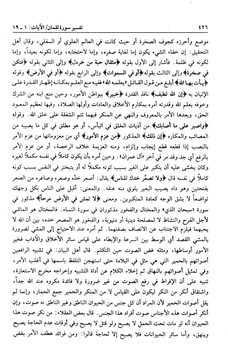 موضع وأحرزه كجوف الصخرة أو حيث كانت في العالم العلوي أو السفلي، وقال أهل التحقيق: إن خفاء الشيء يكون إما لغاية صغره، وإما لاحتجابه، وإما لكونه بعيدا، وإما لكونه في ظلمة. فأشار إلى الأول بقوله مِثْقالَ حَبَّةٍ مِنْ خَرْدَلٍ وإلى الثاني بقوله فَتَكُنْ فِي صَخْرَةٍ وإلى الثالث بقوله أَوْ فِي السَّماواتِ وإلى الرابع بقوله أَوْ فِي الْأَرْضِ وقوله يَأْتِ بِهَا اللَّهُ أبلغ من قول القائل «يعلمه الله» ففيه مع العلم بمكانه إظهار القدرة على الإتيان به إِنَّ اللَّهَ لَطِيفٌ نافذ القدرة خَبِيرٌ ببواطن الأمور، وحين منع ابنه من الشرك وخوفه بعلم الله وقدرته أمره بمكارم الأخلاق والعادات وأولها الصلاة، وفيها تعظيم المعبود الحق، وبعدها الأمر بالمعروف والنهي عن المنكر فبهما تتم الشفقة على خلق الله. وقوله وَاصْبِرْ عَلى ما أَصابَكَ من أذيات الخلق في البأس، أو هو مطلق في كل ما يصيبه من المصائب والمكاره إِنَّ ذلِكَ المذكور مِنْ عَزْمِ الْأُمُورِ أي من معزوماتها من عزم الأمر بالنصب إذا قطعه قطع إيجاب وإلزام، ومنه العزيمة خلاف الرخصة، أو من عزم الأمر بالرفع أي جد وقد مر في آخر «آل عمران» . وحين أمره بأن يكون كاملا في نفسه مكملا لغيره وكان يخشى عليه أن يتكبر على الغير بسبب كونه مكملا له أو يتبختر في النفس بسبب كونه كاملا في نفسه قال وَلا تُصَعِّرْ خَدَّكَ لِلنَّاسِ يقال: أصعر خدّه وصعره وصاعره من الصعر بفتحتين وهو داء يصيب البعير يلوي منه عنقه. والمعنى: أقبل على الناس بكل وجهك تواضعا لا بشق الوجه كعادة المتكبرين. ومعنى لا تَمْشِ فِي الْأَرْضِ مَرَحاً مذكور في سورة «سبحان الذي» والمختال والفخور مذكوران في سورة النساء. فالمختال هو الماشي لأجل الفرح والنشاط لا لمصلحة دينية أو دنيوية، والفخور هو المصعر خده، بين أن الله لا يحبهما فيلزم الاجتناب عن الاتصاف بصفتهما. ثم أمره عند الاحتياج إلى المشي لضرورة بالمشي القصد أي الوسط بين السرعة والإبطاء على قياس سائر الأخلاق والآداب فخير الأمور أوساطها، ومثله غض الصوت حين التكلم. قال أهل البيان: في تشبيه الرافعين أصواتهم بالحمير التي هي مثل في البلادة حتى استهجن التلفظ باسمها في أغلب الأمر، وفي تمثيل أصواتهم بالنهاق ثم إخلاء الكلام عن أداة التشبيه وإخراجه مخرج الاستعارة، تنبيه على أن الإفراط في رفع الصوت من غير ضرورة ولا فائدة مكروه عند الله جدا، واشتقاق أنكر من النكر ليكون على القياس لا من المنكر والحمير جمع الحمار، وإنما لم يقل أصوات الحمير لأن المراد أن كل جنس من الحيوان الناطق وغير الناطق له صوت، وإن أنكر أصوات هذه الأجناس صوت أفراد هذا الجنس. قال بعض العقلاء: من نكر صوت هذا الحيوان أنه لو مات تحت الحمل لا يصيح ولو قتل لا يصيح وفي أوقات عدم الحاجة يصيح وينهق، وأما سائر الحيوانات فلا يصيح إلا لحاجة قالوا: ومن فوائد عطف الأمر بغض