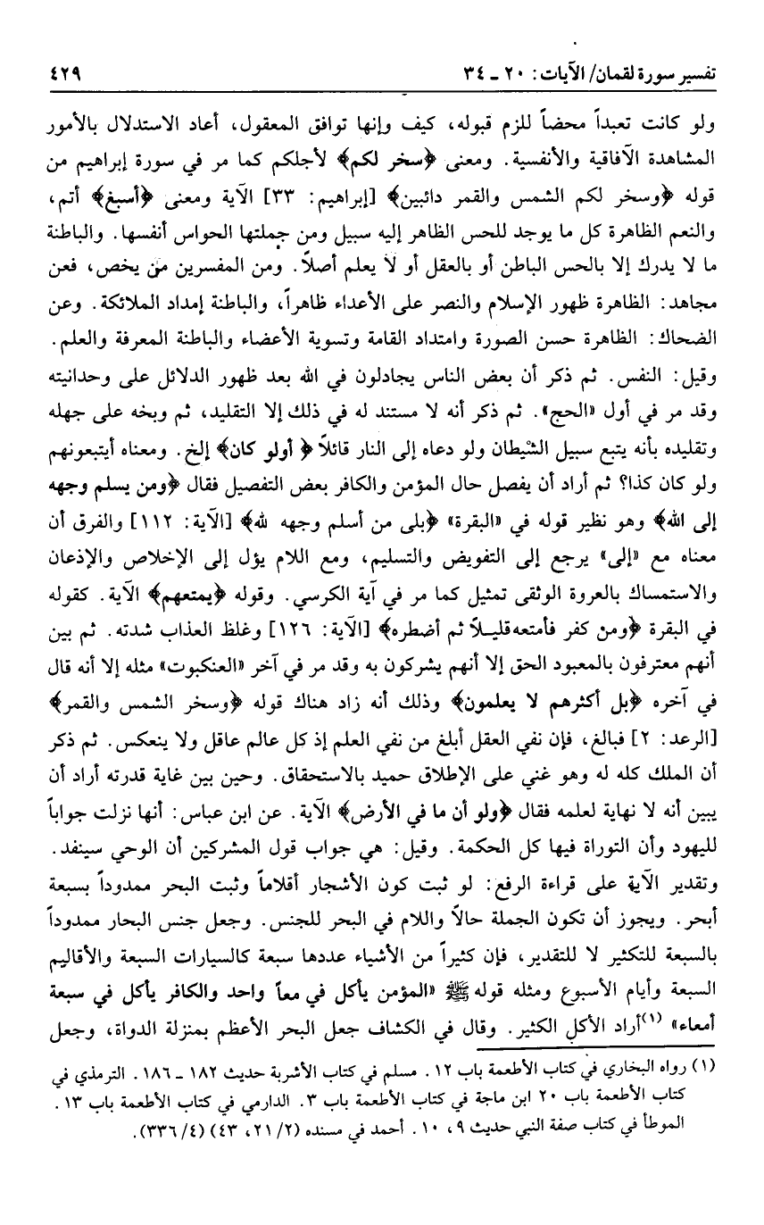 وقيل: النفس. ثم ذكر أن بعض الناس يجادلون في الله بعد ظهور الدلائل على وحدانيته وقد مر في أول «الحج» . ثم ذكر أنه لا مستند له في ذلك إلا التقليد، ثم وبخه على جهله وتقليده بأنه يتبع سبيل الشيطان ولو دعاه إلى النار قائلا أَوَلَوْ كانَ إلخ. ومعناه أيتبعونهم ولو كان كذا؟ ثم أراد أن يفصل حال المؤمن والكافر بعض التفصيل فقال وَمَنْ يُسْلِمْ وَجْهَهُ إِلَى اللَّهِ وهو نظير قوله في «البقرة» بَلى مَنْ أَسْلَمَ وَجْهَهُ لِلَّهِ [الآية: 112] والفرق أن معناه مع «إلى» يرجع إلى التفويض والتسليم، ومع اللام يؤل إلى الإخلاص والإذعان والاستمساك بالعروة الوثقى تمثيل كما مر في آية الكرسي. وقوله يمتعهم الآية. كقوله في البقرة وَمَنْ كَفَرَ فَأُمَتِّعُهُ قَلِيلًا ثُمَّ أَضْطَرُّهُ [الآية: 126] وغلظ العذاب شدته. ثم بين أنهم معترفون بالمعبود الحق إلا أنهم يشركون به وقد مر في آخر «العنكبوت» مثله إلا أنه قال في آخره بَلْ أَكْثَرُهُمْ لا يَعْلَمُونَ وذلك أنه زاد هناك قوله وَسَخَّرَ الشَّمْسَ وَالْقَمَرَ [الرعد: 2] فبالغ، فإن نفي العقل أبلغ من نفي العلم إذ كل عالم عاقل ولا ينعكس. ثم ذكر أن الملك كله له وهو غني على الإطلاق حميد بالاستحقاق. وحين بين غاية قدرته أراد أن يبين أنه لا نهاية لعلمه فقال وَلَوْ أَنَّما فِي الْأَرْضِ الآية. عن ابن عباس: أنها نزلت جوابا لليهود وأن التوراة فيها كل الحكمة. وقيل: هي جواب قول المشركين أن الوحي سينفد.
