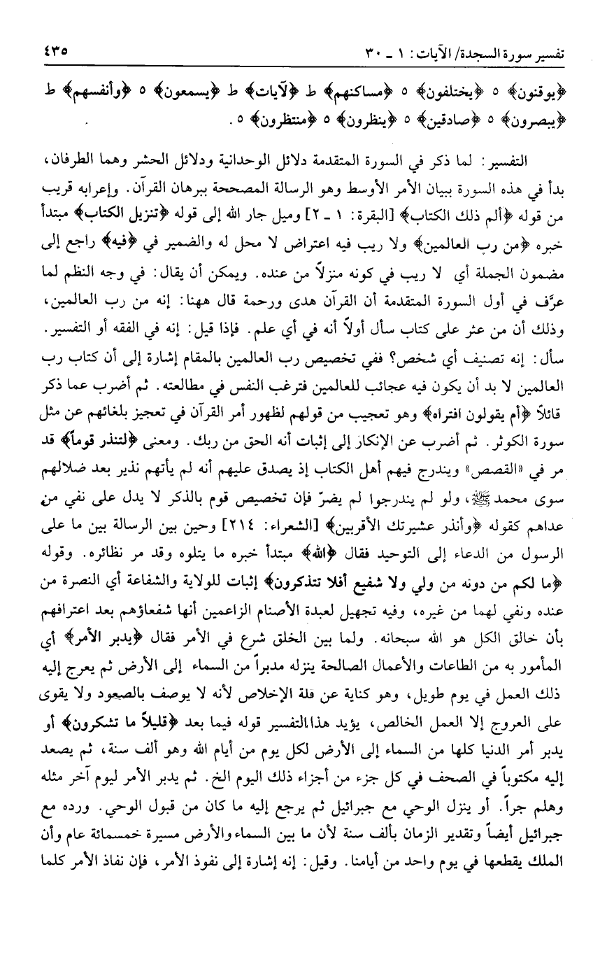 سأل: إنه تصنيف أي شخص؟ ففي تخصيص رب العالمين بالمقام إشارة إلى أن كتاب رب العالمين لا بد أن يكون فيه عجائب للعالمين فترغب النفس في مطالعته. ثم أضرب عما ذكر قائلا أَمْ يَقُولُونَ افْتَراهُ وهو تعجيب من قولهم لظهور أمر القرآن في تعجيز بلغائهم عن مثل سورة الكوثر. ثم أضرب عن الإنكار إلى إثبات أنه الحق من ربك. ومعنى لِتُنْذِرَ قَوْماً قد مر في «القصص» ويندرج فيهم أهل الكتاب إذ يصدق عليهم أنه لم يأتهم نذير بعد ضلالهم سوى محمد صلى الله عليه وسلم، ولو لم يندرجوا لم يضرّ فإن تخصيص قوم بالذكر لا يدل على نفي من عداهم كقوله وَأَنْذِرْ عَشِيرَتَكَ الْأَقْرَبِينَ [الشعراء: 214] وحين بين الرسالة بين ما على الرسول من الدعاء إلى التوحيد فقال اللَّهُ مبتدأ خبره ما يتلوه وقد مر نظائره. وقوله ما لَكُمْ مِنْ دُونِهِ مِنْ وَلِيٍّ وَلا شَفِيعٍ أَفَلا تَتَذَكَّرُونَ إثبات للولاية والشفاعة أي النصرة من عنده ونفي لهما من غيره، وفيه تجهيل لعبدة الأصنام الزاعمين أنها شفعاؤهم بعد اعترافهم بأن خالق الكل هو الله سبحانه. ولما بين الخلق شرع في الأمر فقال يُدَبِّرُ الْأَمْرَ أي المأمور به من الطاعات والأعمال الصالحة ينزله مدبرا من السماء إلى الأرض ثم يعرج إليه ذلك العمل في يوم طويل، وهو كناية عن قلة الإخلاص لأنه لا يوصف بالصعود ولا يقوى على العروج إلا العمل الخالص، يؤيد هذا التفسير قوله فيما بعد قَلِيلًا ما تَشْكُرُونَ أو يدبر أمر الدنيا كلها من السماء إلى الأرض لكل يوم من أيام الله وهو ألف سنة، ثم يصعد إليه مكتوبا في الصحف في كل جزء من أجزاء ذلك اليوم إلخ. ثم يدبر الأمر ليوم آخر مثله وهلم جرا. أو ينزل الوحي مع جبرائيل ثم يرجع إليه ما كان من قبول الوحي. ورده مع جبرائيل أيضا وتقدير الزمان بألف سنة لأن ما بين السماء والأرض مسيرة خمسمائة عام وأن الملك يقطعها في يوم واحد من أيامنا. وقيل: إنه إشارة إلى نفوذ الأمر، فإن نفاذ الأمر كلما