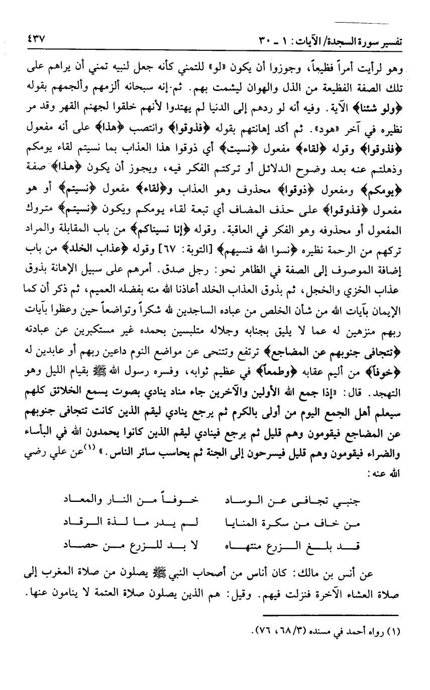 وفسره رسول الله صلى الله عليه وسلم بقيام الليل وهو التهجد. قال: «إذا جمع الله الأولين والآخرين جاء مناد ينادي بصوت يسمع الخلائق كلهم سيعلم أهل الجمع اليوم من أولى بالكرم ثم يرجع ينادي ليقم الذين كانت تتجافى جنوبهم عن المضاجع فيقومون وهم قليل ثم يرجع فينادي ليقم الذين كانوا يحمدون الله في البأساء والضراء فيقومون وهم قليل فيسرحون إلى الجنة ثم يحاسب سائر الناس.» »