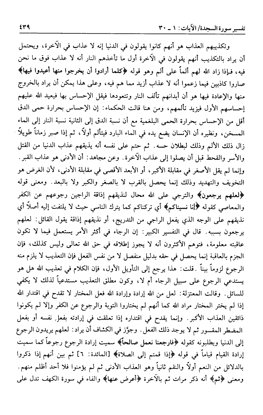 وتكذيبهم العذاب هو أنهم كانوا يقولون في الدنيا إنه لا عذاب في الآخرة، ويحتمل أن يراد بالتكذيب أنهم يقولون في الآخرة أول ما تأخذهم النار أنه لا عذاب فوق ما نحن فيه، فإذا زاد الله لهم ألما على ألم وهو قوله كُلَّما أَرادُوا أَنْ يَخْرُجُوا مِنْها أُعِيدُوا فِيها صاروا كاذبين فيما زعموا أنه لا عذاب أزيد مما هم فيه، وعلى هذا يمكن أن يراد بالخروج منها والإعادة فيها هو أن أبدانهم تألف النار وتتعودها فيقل الإحساس بها فيعيد الله عليهم إحساسهم الأول فيزيد تألمهم، ومن هنا قالت الحكماء: إن الإحساس بحرارة حمى الدق أقل من الإحساس بحرارة الحمى البلغمية مع أن نسبة الدق إلى الثانية نسبة النار إلى الماء المسخن، ونظيره أن الإنسان يضع يده في الماء البارد فيتألم أولا، ثم إذا صبر زمانا طويلا زال ذلك الألم وذلك لبطلان حسه. ثم حتم على نفسه أنه يذيقهم عذاب الدنيا من القتل والأسر والقحط قبل أن يصلوا إلى عذاب الآخرة. وعن مجاهد: أن الأدنى هو عذاب القبر.