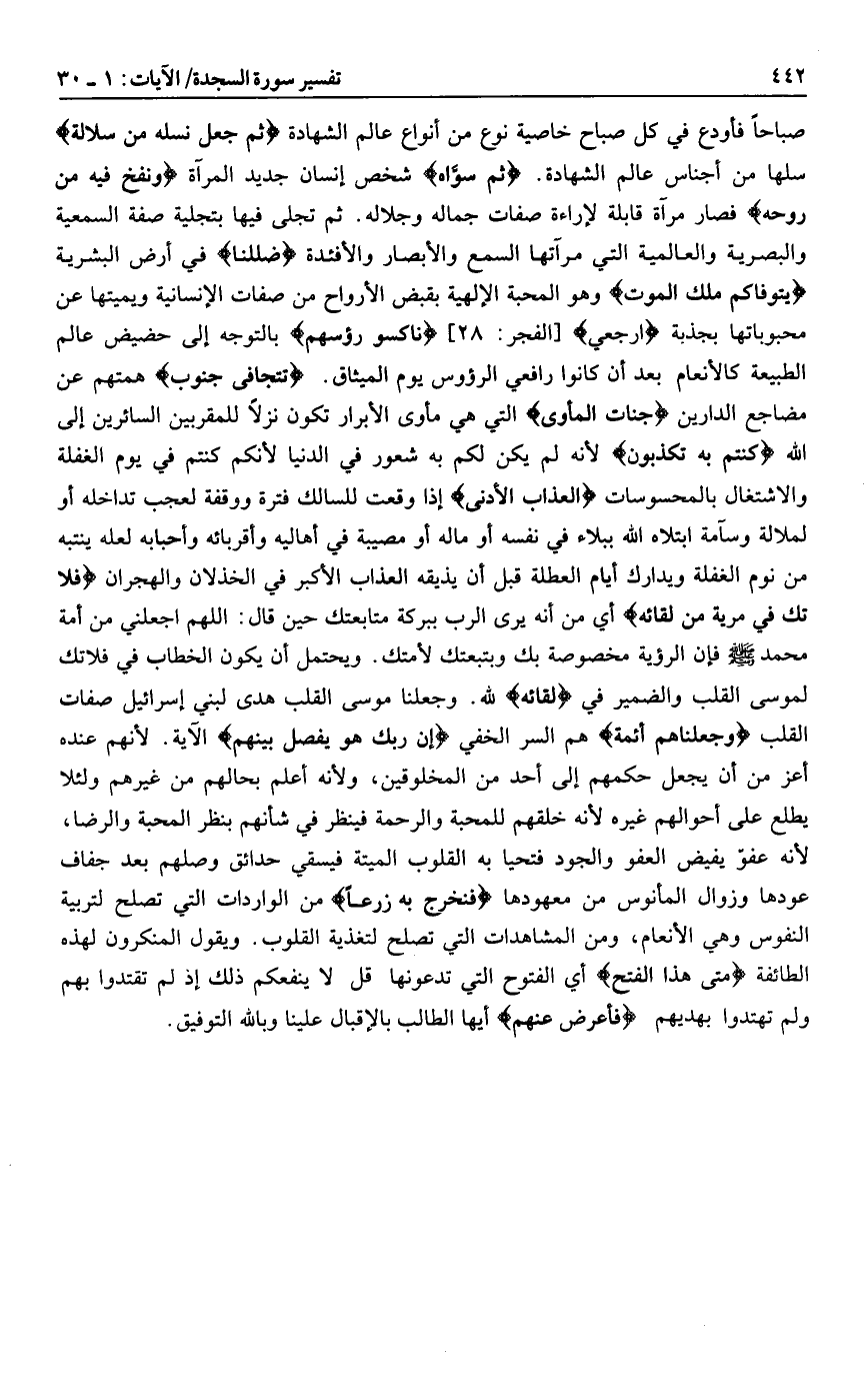 صباحا فأودع في كل صباح خاصية نوع من أنواع عالم الشهادة ثُمَّ جَعَلَ نَسْلَهُ مِنْ سُلالَةٍ سلها من أجناس عالم الشهادة. ثُمَّ سَوَّاهُ شخص إنسان جديد المرآة وَنَفَخَ فِيهِ مِنْ رُوحِهِ فصار مرآة قابلة لإراءة صفات جماله وجلاله. ثم تجلى فيها بتجلية صفة السمعية والبصرية والعالمية التي مرآتها السمع والأبصار والأفئدة ضَلَلْنا في أرض البشرية يَتَوَفَّاكُمْ مَلَكُ الْمَوْتِ وهو المحبة الإلهية بقبض الأرواح من صفات الإنسانية ويميتها عن محبوباتها بجذبة ارْجِعِي [الفجر: 28] ناكِسُوا رُؤُسِهِمْ بالتوجه إلى حضيض عالم الطبيعة كالأنعام بعد أن كانوا رافعي الرؤوس يوم الميثاق. تَتَجافى جُنُوبُهُمْ همتهم عن مضاجع الدارين جَنَّاتُ الْمَأْوى التي هي مأوى الأبرار تكون نزلا للمقربين السائرين إلى الله كُنْتُمْ بِهِ تُكَذِّبُونَ لأنه لم يكن لكم به شعور في الدنيا لأنكم كنتم في يوم الغفلة والاشتغال بالمحسوسات الْعَذابِ الْأَدْنى إذا وقعت للسالك فترة ووقفة لعجب تداخله أو لملالة وسآمة ابتلاه الله ببلاء في نفسه أو ماله أو مصيبة في أهاليه وأقربائه وأحبابه لعله ينتبه من نوم الغفلة ويدارك أيام العطلة قبل أن يذيقه العذاب الأكبر في الخذلان والهجران فلا تك في مرية من لقائه أي من أنه يرى الرب ببركة متابعتك حين قال: اللهم اجعلني من أمة محمد صلى الله عليه وسلم فإن الرؤية مخصوصة بك وبتبعتك لأمتك. ويحتمل أن يكون الخطاب في فلاتك لموسى القلب والضمير في لِقائِهِ لله. وجعلنا موسى القلب هدى لبني إسرائيل صفات القلب وَجَعَلْنا مِنْهُمْ أَئِمَّةً هم السر الخفي إِنَّ رَبَّكَ هُوَ يَفْصِلُ بَيْنَهُمْ الآية. لأنهم عنده أعز من أن يجعل حكمهم إلى أحد من المخلوقين، ولأنه أعلم بحالهم من غيرهم ولئلا يطلع على أحوالهم غيره لأنه خلقهم للمحبة والرحمة فينظر في شأنهم بنظر المحبة والرضا، لأنه عفوّ يفيض العفو والجود فتحيا به القلوب الميتة فيسقي حدائق وصلهم بعد جفاف عودها وزوال المأنوس من معهودها فَنُخْرِجُ بِهِ زَرْعاً من الواردات التي تصلح لتربية النفوس وهي الأنعام، ومن المشاهدات التي تصلح لتغذية القلوب. ويقول المنكرون لهذه الطائفة مَتى هذَا الْفَتْحُ أي الفتوح التي تدعونها قل لا ينفعكم ذلك إذ لم تقتدوا بهم ولم تهتدوا بهديهم فَأَعْرِضْ عَنْهُمْ أيها الطالب بالإقبال علينا وبالله التوفيق.