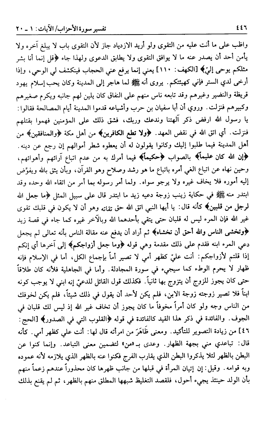 إِنَّ اللَّهَ كانَ عَلِيماً بالصواب حَكِيماً فيما أمرك به من عدم اتباع آرائهم وأهوائهم، وحين نهاه عن اتباع الغي أمره باتباع ما هو رشد وصلاح وهو القرآن، وبأن يثق بالله ويفوّض إليه أموره فلا يخاف غيره ولا يرجو سواه. ولما أمر رسوله بما أمر من اتقاء الله وحده وقد ابتدر منه صلى الله عليه وسلم في حكاية زينب زوجة دعيه زيد ما ابتدر قال على سبيل المثل ما جَعَلَ اللَّهُ لِرَجُلٍ مِنْ قَلْبَيْنِ كأنه قال: يا أيها النبي اتق الله حق تقاته وهو أن لا يكون في قلبك تقوى غير الله فإن المرء ليس له قلبان حتى يتقي بأحدهما الله وبالآخر غيره كما جاء في قصة زيد وَتَخْشَى النَّاسَ وَاللَّهُ أَحَقُّ أَنْ تَخْشاهُ ثم أراد أن يدفع عنه مقالة الناس بأنه تعالى لم يجعل دعي المرء ابنه فقدم على ذلك مقدمة وهي قوله وَما جَعَلَ أَزْواجَكُمُ إلى آخرها أي إنكم إذا قلتم لأزواجكم: أنت عليّ كظهر أمي لا تصير أما بإجماع الكل، أما في الإسلام فإنه ظهار لا يحرم الوطء كما سيجيء في سورة المجادلة. وأما في الجاهلية فلأنه كان طلاقا حتى كان يجوز للزوج أن يتزوج بها ثانيا. فكذلك قول القائل للدعيّ إنه ابني لا يوجب كونه ابنا فلا تصير زوجته زوجة الابن، فلم يكن لأحد أن يقول في ذلك شيئا، فلم يكن لخوفك من الناس وجه ولو كان أمرا مخوفا ما كان يجوز أن تخاف غير الله إذ ليس لك قلبان في الجوف. والفائدة في ذكر هذا القيد كالفائدة في قوله الْقُلُوبُ الَّتِي فِي الصُّدُورِ [الحج: