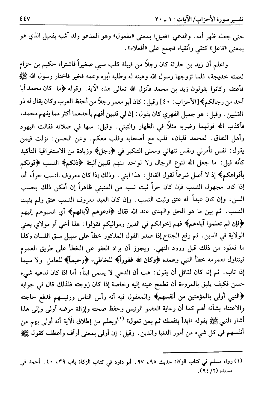 وقوله ما كانَ مُحَمَّدٌ أَبا أَحَدٍ مِنْ رِجالِكُمْ [الأحزاب: 40] وقيل: كان أبو معمر رجلا من أحفظ العرب وكان يقال له ذو القلبين. وقيل: هو جميل الفهري كان يقول: إن لي قلبين أفهم بأحدهما أكثر مما يفهم محمد، فأكذب الله قولهما وضربه مثلا في الظهار والتبني. وقيل: سها في صلاته فقالت اليهود وأهل النفاق: لمحمد قلبان، قلب مع أصحابه وقلب معكم. وعن الحسن: نزلت فيمن يقول: نفس تأمرني ونفس تنهاني ومعنى التنكير في لِرَجُلٍ وزيادة من الاستغراقية التأكيد كأنه قيل: ما جعل الله لنوع الرجال ولا لواحد منهم قلبين البتة ذلِكُمْ النسب قَوْلُكُمْ بِأَفْواهِكُمْ إذ لا أصل شرعا لقول القائل: هذا ابني. وذلك إذا كان معروف النسب حرا، أما إذا كان مجهول النسب فإن كان حرا ثبت نسبه من المتبني ظاهرا إن أمكن ذلك بحسب السن، وإن كان عبدا له عتق وثبت النسب. وإن كان العبد معروف النسب عتق ولم يثبت النسب. ثم بين ما هو الحق والهدى عند الله فقال ادْعُوهُمْ لِآبائِهِمْ أي انسبوهم إليهم فَإِنْ لَمْ تَعْلَمُوا آباءَهُمْ فهم إخوانكم في الدين ومواليكم فقولوا: هذا أخي أو مولاي يعني الولاية في الدين. ثم رفع الجناح إذا صدر القول المذكور خطأ على سبيل سبق اللسان وكذا ما فعلوه من ذلك قبل ورود النهي. ويجوز أن يراد العفو عن الخطأ على طريق العموم فيتناول لعمومه خطأ النبي وعمده وَكانَ اللَّهُ غَفُوراً للخاطيء رَحِيماً للعامل ولا سيما إذا تاب. ثم إنه كان لقائل أن يقول: هب أن الدعي لا يسمى ابنا، أما إذا كان لدعيه شيء حسن فكيف يليق بالمروءة أن تطمح عينه إليه وخاصة إذا كان زوجته فلذلك قال في جوابه النَّبِيُّ أَوْلى بِالْمُؤْمِنِينَ مِنْ أَنْفُسِهِمْ والمعقول فيه أنه رأس الناس ورئيسهم فدفع حاجته والاعتناء بشأنه أهم كما أن رعاية العضو الرئيس وحفظ صحته وإزالة مرضه أولى وإلى هذا أشار النبي صلى الله عليه وسلم