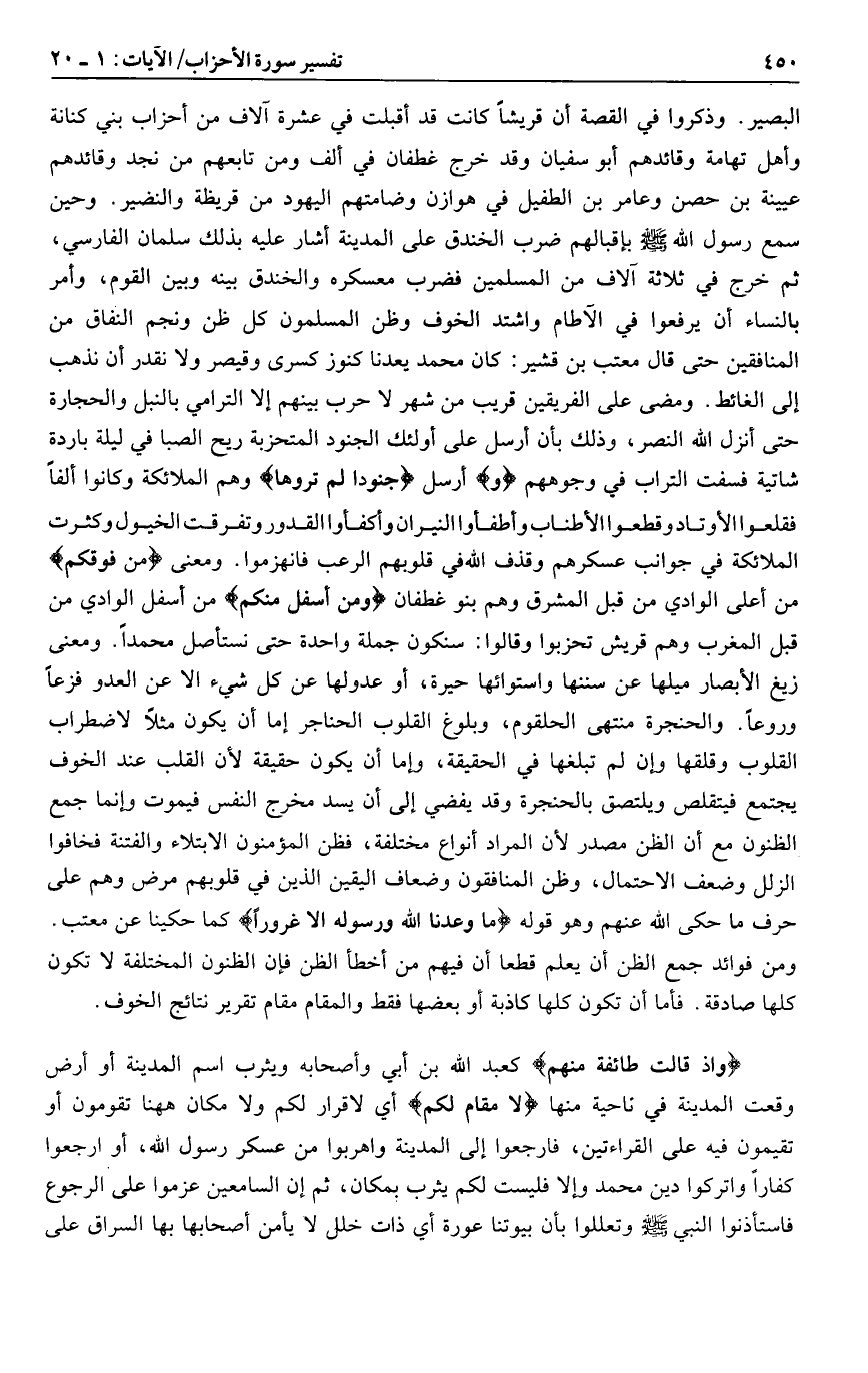 وذلك بأن أرسل على أولئك الجنود المتحزبة ريح الصبا في ليلة باردة شاتية فسفت التراب في وجوههم وَأرسل جُنُوداً لَمْ تَرَوْها وهم الملائكة وكانوا ألفا فقلعوا الأوتاد وقطعوا الأطناب وأطفأوا النيران وأكفئوا القدور وتفرقت الخيول وكثرت الملائكة في جوانب عسكرهم وقذف الله في قلوبهم الرعب فانهزموا. ومعنى مِنْ فَوْقِكُمْ من أعلى الوادي من قبل المشرق وهم بنو غطفان وَمِنْ أَسْفَلَ مِنْكُمْ من أسفل الوادي من قبل المغرب وهم قريش تحزبوا وقالوا: سنكون جملة واحدة حتى نستأصل محمدا. ومعنى زيغ الأبصار ميلها عن سننها واستوائها حيرة، أو عدولها عن كل شيء الا عن العدو فزعا وروعا. والحنجرة منتهى الحلقوم، وبلوغ القلوب الحناجر إما أن يكون مثلا لاضطراب القلوب وقلقها وإن لم تبلغها في الحقيقة، وإما أن يكون حقيقة لأن القلب عند الخوف يجتمع فيتقلص ويلتصق بالحنجرة وقد يفضي إلى أن يسد مخرج النفس فيموت وإنما جمع الظنون مع أن الظن مصدر لأن المراد أنواع مختلفة، فظن المؤمنون الابتلاء والفتنة فخافوا الزلل وضعف الاحتمال، وظن المنافقون وضعاف اليقين الذين في قلوبهم مرض وهم على حرف ما حكى الله عنهم وهو قوله ما وَعَدَنَا اللَّهُ وَرَسُولُهُ إِلَّا غُرُوراً كما حكينا عن معتب.