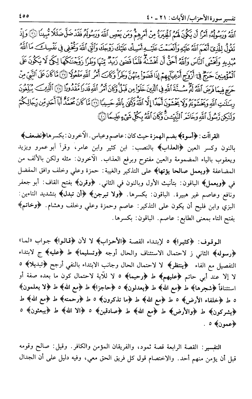 كَثِيراً هـ لإبتداء القصة الْأَحْزابَ لا لأن قالُوا جواب «لما» رَسُولُهُ الثاني ز لاحتمال الاستئناف والحال أوجه وَتَسْلِيماً ط عَلَيْهِ ج لابتداء التفصيل مع الفاء يَنْتَظِرُ لا لاحتمال الحال وجانب الابتداء بالنفي أرجح تَبْدِيلًا هـ لا إلا عند أبي حاتم عَلَيْهِمْ ط رَحِيماً هـ لا للآية لاحتمال كون ما بعده صفة أو استئنافا شجرها ط مع الله ط يعدلون هـ حاجِزاً ط مع الله ط لا يعلمون هـ ط خلفاء الأرض هـ ط مع الله ط ما تذكرون هـ ط رحمته ط مع الله ط يشركون ط والأرض ط مع الله ط صادقين هـ إِلَّا اللَّهَ ط يبعثون هـ عمون هـ.