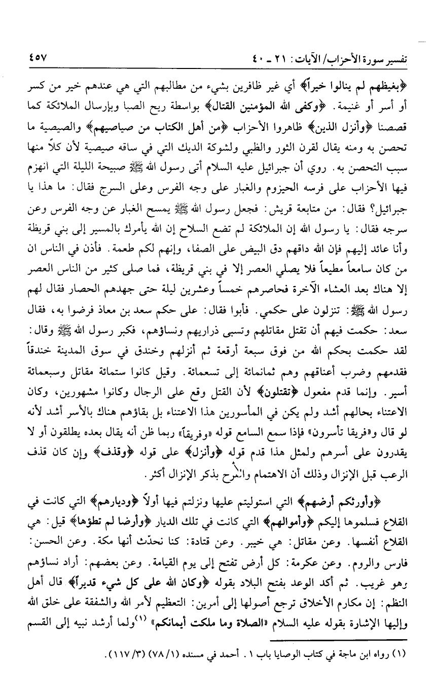 بِغَيْظِهِمْ لَمْ يَنالُوا خَيْراً أي غير ظافرين بشيء من مطالبهم التي هي عندهم خير من كسر أو أسر أو غنيمة. وَكَفَى اللَّهُ الْمُؤْمِنِينَ الْقِتالَ بواسطة ريح الصبا وبإرسال الملائكة كما قصصنا وَأَنْزَلَ الَّذِينَ ظاهروا الأحزاب مِنْ أَهْلِ الْكِتابِ مِنْ صَياصِيهِمْ والصيصية ما تحصن به ومنه يقال لقرن الثور والظبي ولشوكة الديك التي في ساقه صيصية لأن كلا منها سبب التحصن به.