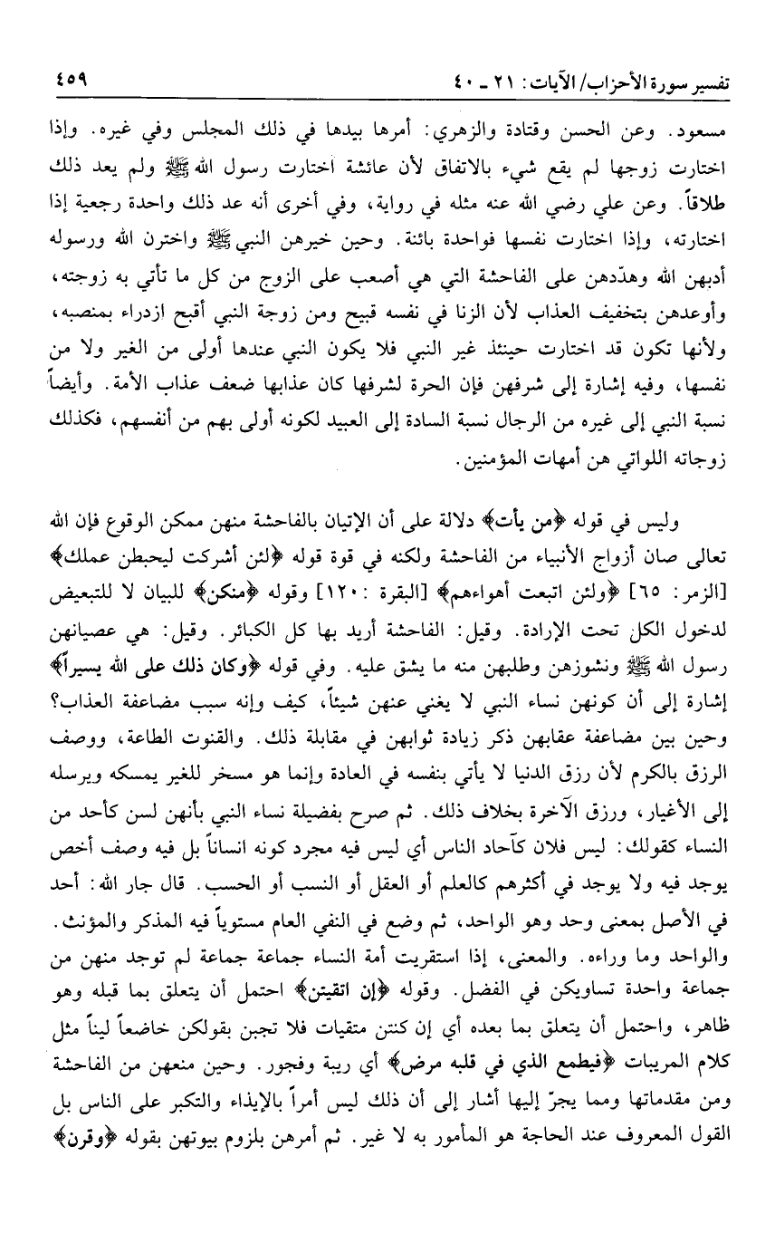 والواحد وما وراءه. والمعنى، إذا استقريت أمة النساء جماعة جماعة لم توجد منهن من جماعة واحدة تساويكن في الفضل. وقوله إِنِ اتَّقَيْتُنَّ احتمل أن يتعلق بما قبله وهو ظاهر، واحتمل أن يتعلق بما بعده أي إن كنتن متقيات فلا تجبن بقولكن خاضعا لينا مثل كلام المريبات فَيَطْمَعَ الَّذِي فِي قَلْبِهِ مَرَضٌ أي ريبة وفجور. وحين منعهن من الفاحشة ومن مقدماتها ومما يجرّ إليها أشار إلى أن ذلك ليس أمرا بالإيذاء والتكبر على الناس بل القول المعروف عند الحاجة هو المأمور به لا غير. ثم أمرهن بلزوم بيوتهن بقوله وَقَرْنَ