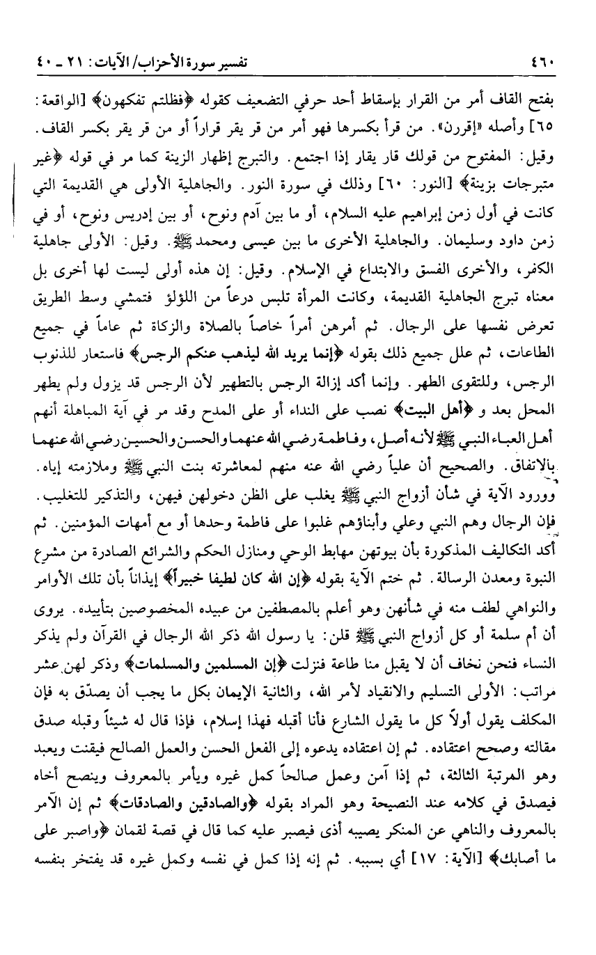 وقيل: المفتوح من قولك قار يقار إذا اجتمع. والتبرج إظهار الزينة كما مر في قوله غَيْرَ مُتَبَرِّجاتٍ بِزِينَةٍ [النور: 60] وذلك في سورة النور. والجاهلية الأولى هي القديمة التي كانت في أول زمن إبراهيم عليه السلام، أو ما بين آدم ونوح، أو بين إدريس ونوح، أو في زمن داود وسليمان. والجاهلية الأخرى ما بين عيسى ومحمد صلى الله عليه وسلم. وقيل: الأولى جاهلية الكفر، والأخرى الفسق والابتداع في الإسلام. وقيل: إن هذه أولى ليست لها أخرى بل معناه تبرج الجاهلية القديمة، وكانت المرأة تلبس درعا من اللؤلؤ فتمشي وسط الطريق تعرض نفسها على الرجال. ثم أمرهن أمرا خاصا بالصلاة والزكاة ثم عاما في جميع الطاعات، ثم علل جميع ذلك بقوله إِنَّما يُرِيدُ اللَّهُ لِيُذْهِبَ عَنْكُمُ الرِّجْسَ فاستعار للذنوب الرجس، وللتقوى الطهر. وإنما أكد إزالة الرجس بالتطهير لأن الرجس قد يزول ولم يطهر المحل بعد وأَهْلَ الْبَيْتِ نصب على النداء أو على المدح وقد مر في آية المباهلة أنهم أهل العباء النبي صلى الله عليه وسلم لأنه أصل، وفاطمة رضي الله عنهما والحسن والحسين رضي الله عنهما بالاتفاق. والصحيح أن عليا رضي الله عنه منهم لمعاشرته بنت النبي صلى الله عليه وسلم وملازمته إياه.