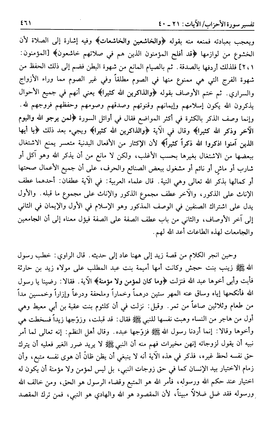 وإنما وصف الذكر بالكثرة في أكثر المواضع فقال في أوائل السورة لِمَنْ كانَ يَرْجُوا اللَّهَ وَالْيَوْمَ الْآخِرَ وَذَكَرَ اللَّهَ كَثِيراً وقال في الآية وَالذَّاكِرِينَ اللَّهَ كَثِيراً ويجيء بعد ذلك يا أَيُّهَا الَّذِينَ آمَنُوا اذْكُرُوا اللَّهَ ذِكْراً كَثِيراً لأن الإكثار من الأفعال البدنية متعسر يمنع الاشتغال ببعضها من الاشتغال بغيرها بحسب الأغلب، ولكن لا مانع من أن يذكر الله وهو آكل أو شارب أو ماش أو نائم أو مشغول ببعض الصنائع والحرف، على أن جميع الأعمال صحتها أو كمالها بذكر الله تعالى وهي النية. قال علماء العربية: في الآية عطفان: أحدهما عطف الإناث على الذكور، والآخر عطف مجموع الذكور والإناث على مجموع ما قبله. والأول يدل على اشتراك الصنفين في الوصف المذكور وهو الإسلام في الأول والإيمان في الثاني إلى آخر الأوصاف، والثاني من باب عطف الصفة على الصفة فيؤل معناه إلى أن الجامعين والجامعات لهذه الطاعات أعد الله لهم.