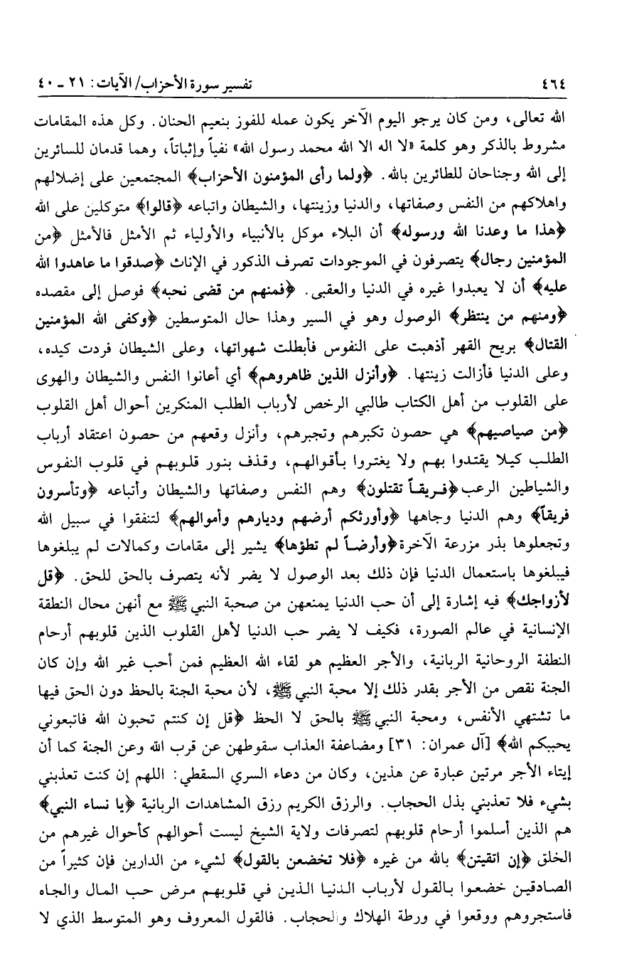 الله تعالى، ومن كان يرجو اليوم الآخر يكون عمله للفوز بنعيم الحنان. وكل هذه المقامات مشروط بالذكر وهو كلمة «لا اله الا الله محمد رسول الله» نفيا وإثباتا، وهما قدمان للسائرين إلى الله وجناحان للطائرين بالله. وَلَمَّا رَأَ الْمُؤْمِنُونَ الْأَحْزابَ المجتمعين على إضلالهم وإهلاكهم من النفس وصفاتها، والدنيا وزينتها، والشيطان واتباعه قالُوا متوكلين على الله هذا ما وَعَدَنَا اللَّهُ وَرَسُولُهُ أن البلاء موكل بالأنبياء والأولياء ثم الأمثل فالأمثل مِنَ الْمُؤْمِنِينَ رِجالٌ يتصرفون في الموجودات تصرف الذكور في الإناث صَدَقُوا ما عاهَدُوا اللَّهَ عَلَيْهِ أن لا يعبدوا غيره في الدنيا والعقبى. فَمِنْهُمْ مَنْ قَضى نَحْبَهُ فوصل إلى مقصده وَمِنْهُمْ مَنْ يَنْتَظِرُ الوصول وهو في السير وهذا حال المتوسطين وَكَفَى اللَّهُ الْمُؤْمِنِينَ الْقِتالَ بريح القهر أذهبت على النفوس فأبطلت شهواتها، وعلى الشيطان فردت كيده، وعلى الدنيا فأزالت زينتها. وَأَنْزَلَ الَّذِينَ ظاهَرُوهُمْ أي أعانوا النفس والشيطان والهوى على القلوب من أهل الكتاب طالبي الرخص لأرباب الطلب المنكرين أحوال أهل القلوب مِنْ صَياصِيهِمْ هي حصون تكبرهم وتجبرهم، وأنزل وقعهم من حصون اعتقاد أرباب الطلب كيلا يقتدوا بهم ولا يغتروا بأقوالهم، وقذف بنور قلوبهم في قلوب النفوس والشياطين الرعب فَرِيقاً تَقْتُلُونَ وهم النفس وصفاتها والشيطان وأتباعه وَتَأْسِرُونَ فَرِيقاً وهم الدنيا وجاهها وَأَوْرَثَكُمْ أَرْضَهُمْ وَدِيارَهُمْ وَأَمْوالَهُمْ لتنفقوا في سبيل الله وتجعلوها بذر مزرعة الآخرة وَأَرْضاً لَمْ تَطَؤُها يشير إلى مقامات وكمالات لم يبلغوها فيبلغوها باستعمال الدنيا فإن ذلك بعد الوصول لا يضر لأنه يتصرف بالحق للحق. قُلْ لِأَزْواجِكَ فيه إشارة إلى أن حب الدنيا يمنعهن من صحبة النبي صلى الله عليه وسلم مع أنهن محال النطفة الإنسانية في عالم الصورة، فكيف لا يضر حب الدنيا لأهل القلوب الذين قلوبهم أرحام النطفة الروحانية الربانية، والأجر العظيم هو لقاء الله العظيم فمن أحب غير الله وإن كان الجنة نقص من الأجر بقدر ذلك إلا محبة النبي صلى الله عليه وسلم، لأن محبة الجنة بالحظ دون الحق فيها ما تشتهي الأنفس، ومحبة النبي صلى الله عليه وسلم بالحق لا الحظ قُلْ إِنْ كُنْتُمْ تُحِبُّونَ اللَّهَ فَاتَّبِعُونِي يُحْبِبْكُمُ اللَّهُ [آل عمران: 31] ومضاعفة العذاب سقوطهن عن قرب الله وعن الجنة كما أن إيتاء الأجر مرتين عبارة عن هذين، وكان من دعاء السري السقطي: اللهم إن كنت تعذبني بشيء فلا تعذبني بذل الحجاب. والرزق الكريم رزق المشاهدات الربانية يا نِساءَ النَّبِيِّ هم الذين أسلموا أرحام قلوبهم لتصرفات ولاية الشيخ ليست أحوالهم كأحوال غيرهم من الخلق إِنِ اتَّقَيْتُنَّ بالله من غيره فَلا تَخْضَعْنَ بِالْقَوْلِ لشيء من الدارين فإن كثيرا من الصادقين خضعوا بالقول لأرباب الدنيا الذين في قلوبهم مرض حب المال والجاه فاستجروهم ووقعوا في ورطة الهلاك والحجاب. فالقول المعروف وهو المتوسط الذي لا