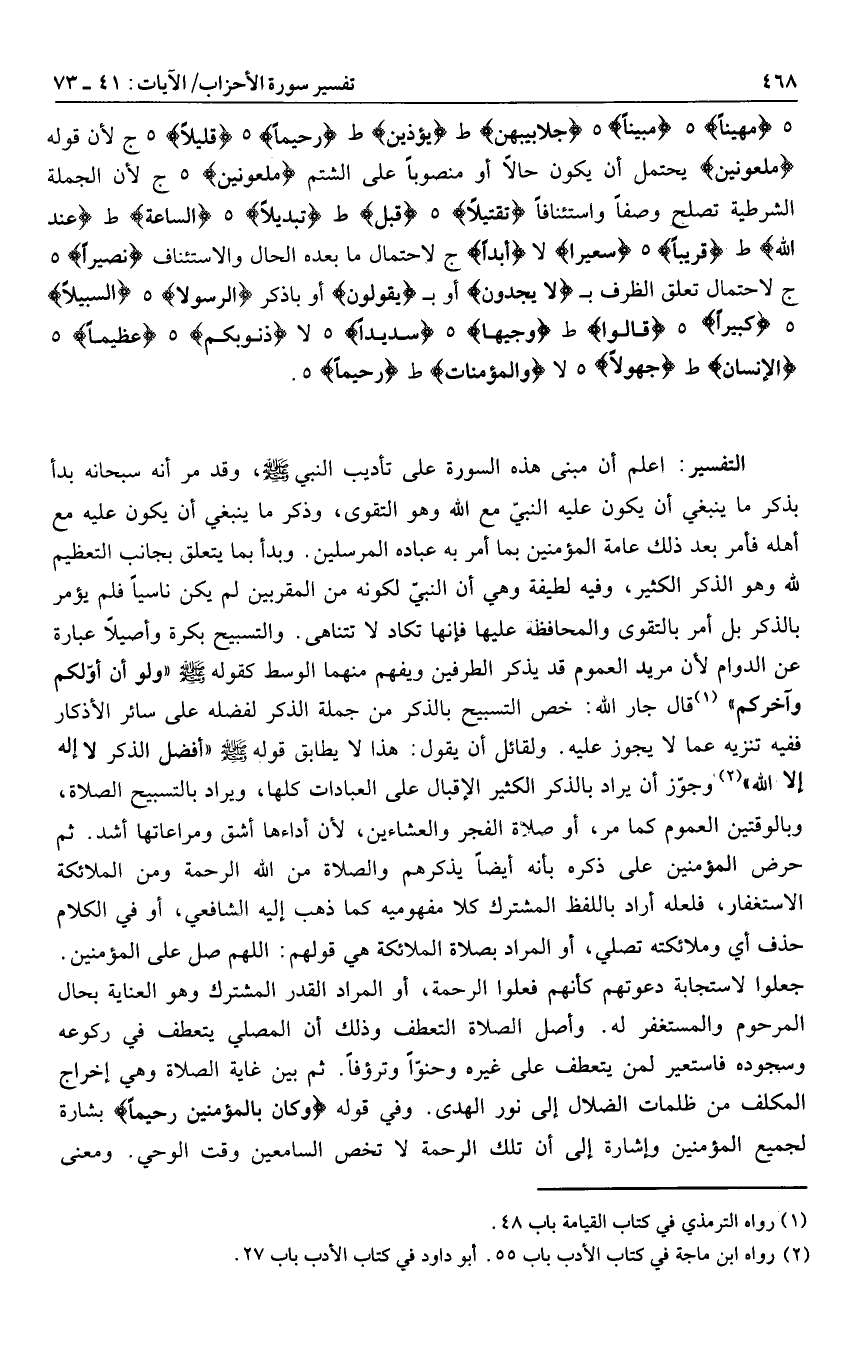 وجوّز أن يراد بالذكر الكثير الإقبال على العبادات كلها، ويراد بالتسبيح الصلاة، وبالوقتين العموم كما مر، أو صلاة الفجر والعشاءين، لأن أداءها أشق ومراعاتها أشد. ثم حرض المؤمنين على ذكره بأنه أيضا يذكرهم والصلاة من الله الرحمة ومن الملائكة الاستغفار، فلعله أراد باللفظ المشترك كلا مفهومية كما ذهب إليه الشافعي، أو في الكلام حذف أي وملائكته تصلي، أو المراد بصلاة الملائكة هي قولهم: اللهم صل على المؤمنين.