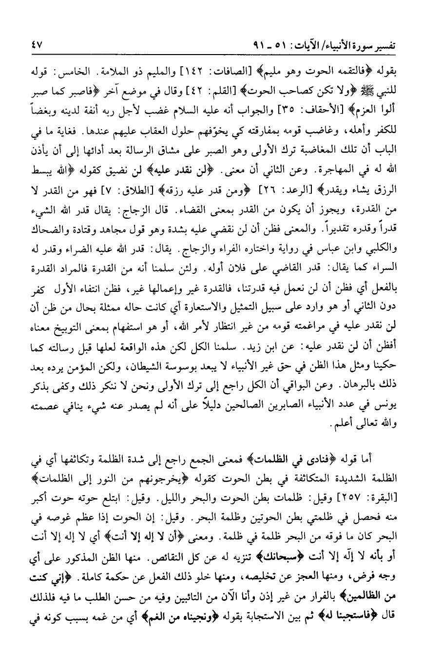 بقوله فَالْتَقَمَهُ الْحُوتُ وَهُوَ مُلِيمٌ [الصافات: 142] والمليم ذو الملامة. الخامس: قوله للنبي صلى الله عليه وسلم وَلا تَكُنْ كَصاحِبِ الْحُوتِ [القلم: 42] وقال في موضع آخر فَاصْبِرْ كَما صَبَرَ أُولُوا الْعَزْمِ [الأحقاف: 35] والجواب أنه عليه السلام غضب لأجل ربه أنفة لدينه وبغضا للكفر وأهله، وغاضب قومه بمفارقته كي يخوّفهم حلول العقاب عليهم عندها. فغاية ما في الباب أن تلك المغاضبة ترك الأولى وهو الصبر على مشاق الرسالة بعد أدائها إلى أن يأذن الله له في المهاجرة. وعن الثاني أن معنى. لَنْ نَقْدِرَ عَلَيْهِ لن نضيق كقوله اللَّهُ يَبْسُطُ الرِّزْقَ لِمَنْ يَشاءُ وَيَقْدِرُ [الرعد: 26] وَمَنْ قُدِرَ عَلَيْهِ رِزْقُهُ [الطلاق: 7] فهو من القدر لا من القدرة، ويجوز أن يكون من القدر بمعنى القضاء. قال الزجاج: يقال قدر الله الشيء قدرا وقدره تقديرا. والمعنى فظن أن لن نقضي عليه بشدة وهو قول مجاهد وقتادة والضحاك والكلبي وابن عباس في رواية واختاره الفراء والزجاج. يقال: قدر الله عليه الضراء وقدر له السراء كما يقال: قدر القاضي على فلان أوله. ولئن سلمنا أنه من القدرة فالمراد القدرة بالفعل أي فظن أن لن نعمل فيه قدرتنا، فالقدرة غير وإعمالها غير، فظن انتفاء الأول كفر دون الثاني أو هو وارد على سبيل التمثيل والاستعارة أي كانت حاله ممثلة بحال من ظن أن لن نقدر عليه في مراغمته قومه من غير انتظار لأمر الله، أو هو استفهام بمعنى التوبيخ معناه أفظن أن لن نقدر عليه: عن ابن زيد. سلمنا الكل لكن هذه الواقعة لعلها قبل رسالته كما حكينا ومثل هذا الظن في حق غير الأنبياء لا يبعد بوسوسة الشيطان، ولكن المؤمن يرده بعد ذلك بالبرهان. وعن البواقي أن الكل راجع إلى ترك الأولى ونحن لا ننكر ذلك وكفى بذكر يونس في عدد الأنبياء الصابرين الصالحين دليلا على أنه لم يصدر عنه شيء ينافي عصمته والله تعالى أعلم.