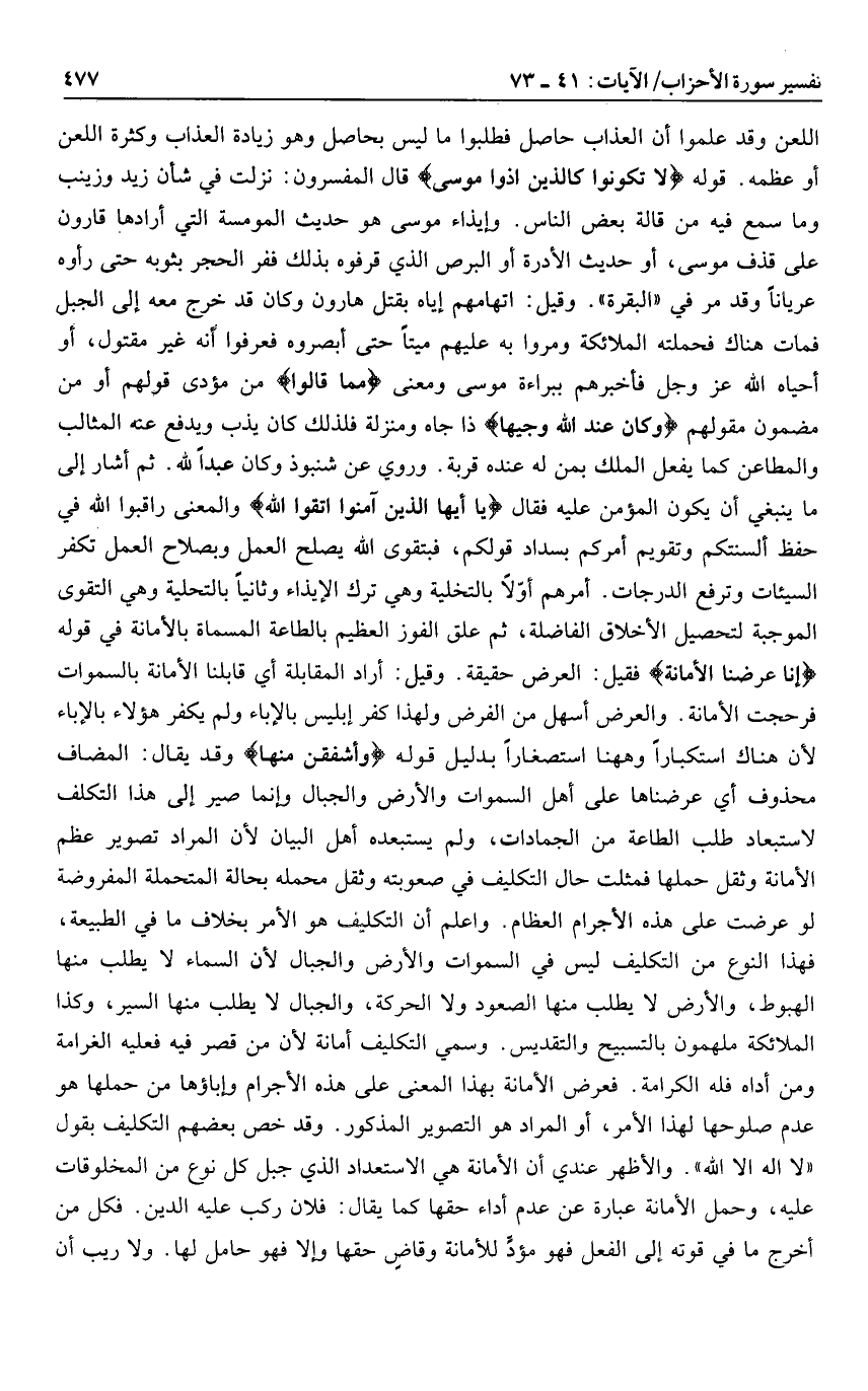 اللعن وقد علموا أن العذاب حاصل فطلبوا ما ليس بحاصل وهو زيادة العذاب وكثرة اللعن أو عظمه. قوله لا تَكُونُوا كَالَّذِينَ آذَوْا مُوسى قال المفسرون: نزلت في شأن زيد وزينب وما سمع فيه من قالة بعض الناس. وإيذاء موسى هو حديث المومسة التي أرادها قارون على قذف موسى، أو حديث الأدرة أو البرص الذي قرفوه بذلك ففر الحجر بثوبه حتى رأوه عريانا وقد مر في «البقرة» . وقيل: اتهامهم إياه بقتل هارون وكان قد خرج معه إلى الجبل فمات هناك فحملته الملائكة ومروا به عليهم ميتا حتى أبصروه فعرفوا أنه غير مقتول، أو أحياه الله عز وجل فأخبرهم ببراءة موسى ومعنى مِمَّا قالُوا من مؤدى قولهم أو من مضمون مقولهم وَكانَ عِنْدَ اللَّهِ وَجِيهاً ذا جاه ومنزلة فلذلك كان يذب ويدفع عنه المثالب والمطاعن كما يفعل الملك بمن له عنده قربة. وروي عن شنبوذ وكان عبدا لله. ثم أشار إلى ما ينبغي أن يكون المؤمن عليه فقال يا أَيُّهَا الَّذِينَ آمَنُوا اتَّقُوا اللَّهَ والمعنى راقبوا الله في حفظ ألسنتكم وتقويم أمركم بسداد قولكم، فبتقوى الله يصلح العمل وبصلاح العمل تكفر السيئات وترفع الدرجات. أمرهم أوّلا بالتخلية وهي ترك الإيذاء وثانيا بالتحلية وهي التقوى الموجبة لتحصيل الأخلاق الفاضلة، ثم علق الفوز العظيم بالطاعة المسماة بالأمانة في قوله إِنَّا عَرَضْنَا الْأَمانَةَ فقيل: العرض حقيقة. وقيل: أراد المقابلة أي قابلنا الأمانة بالسماوات فرحجت الأمانة. والعرض أسهل من الفرض ولهذا كفر إبليس بالإباء ولم يكفر هؤلاء بالإباء لأن هناك استكبارا وهاهنا استصغارا بدليل قوله وَأَشْفَقْنَ مِنْها وقد يقال: المضاف محذوف أي عرضناها على أهل السموات والأرض والجبال وإنما صير إلى هذا التكلف لاستبعاد طلب الطاعة من الجمادات، ولم يستبعده أهل البيان لأن المراد تصوير عظم الأمانة وثقل حملها فمثلت حال التكليف في صعوبته وثقل محمله بحالة المتحملة المفروضة لو عرضت على هذه الأجرام العظام. واعلم أن التكليف هو الأمر بخلاف ما في الطبيعة، فهذا النوع من التكليف ليس في السموات والأرض والجبال لأن السماء لا يطلب منها الهبوط، والأرض لا يطلب منها الصعود ولا الحركة، والجبال لا يطلب منها السير، وكذا الملائكة ملهمون بالتسبيح والتقديس. وسمي التكليف أمانة لأن من قصر فيه فعليه الغرامة ومن أداه فله الكرامة. فعرض الأمانة بهذا المعنى على هذه الأجرام وإباؤها من حملها هو عدم صلوحها لهذا الأمر، أو المراد هو التصوير المذكور. وقد خص بعضهم التكليف بقول «لا إله الا الله» . والأظهر عندي أن الأمانة هي الاستعداد الذي جبل كل نوع من المخلوقات عليه، وحمل الأمانة عبارة عن عدم أداء حقها كما يقال: فلان ركب عليه الدين. فكل من أخرج ما في قوته إلى الفعل فهو مؤدّ للأمانة وقاض حقها وإلا فهو حامل لها. ولا ريب أن