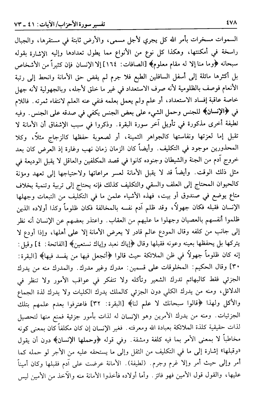 ومؤنة كالحيوان المحتاج إلى العلف والسقي والتكليف كذلك فإنه يحتاج إلى تربية وتنمية بخلاف متاع يوضع في صندوق أو بيت، فهذه الأشياء علمن ما في التكليف من التبعات وجهلها الإنسان فقبله فكان جهولا، وقد ظلم آدم نفسه بالمخالفة فكان ظلوما وكذا أولاده الذين ظلموا أنفسهم بالعصيان وجهلوا ما عليهم من العقاب. واعتذر بعضهم عن الإنسان أنه نظر إلى جانب من كلفه وقال المودع عالم قادر لا يعرض الأمانة إلا على أهلها، وإذا أودع لا يتركها بل يحفظها بعينه وعونه فقبلها وقال إِيَّاكَ نَعْبُدُ وَإِيَّاكَ نَسْتَعِينُ [الفاتحة: 4] وقيل: