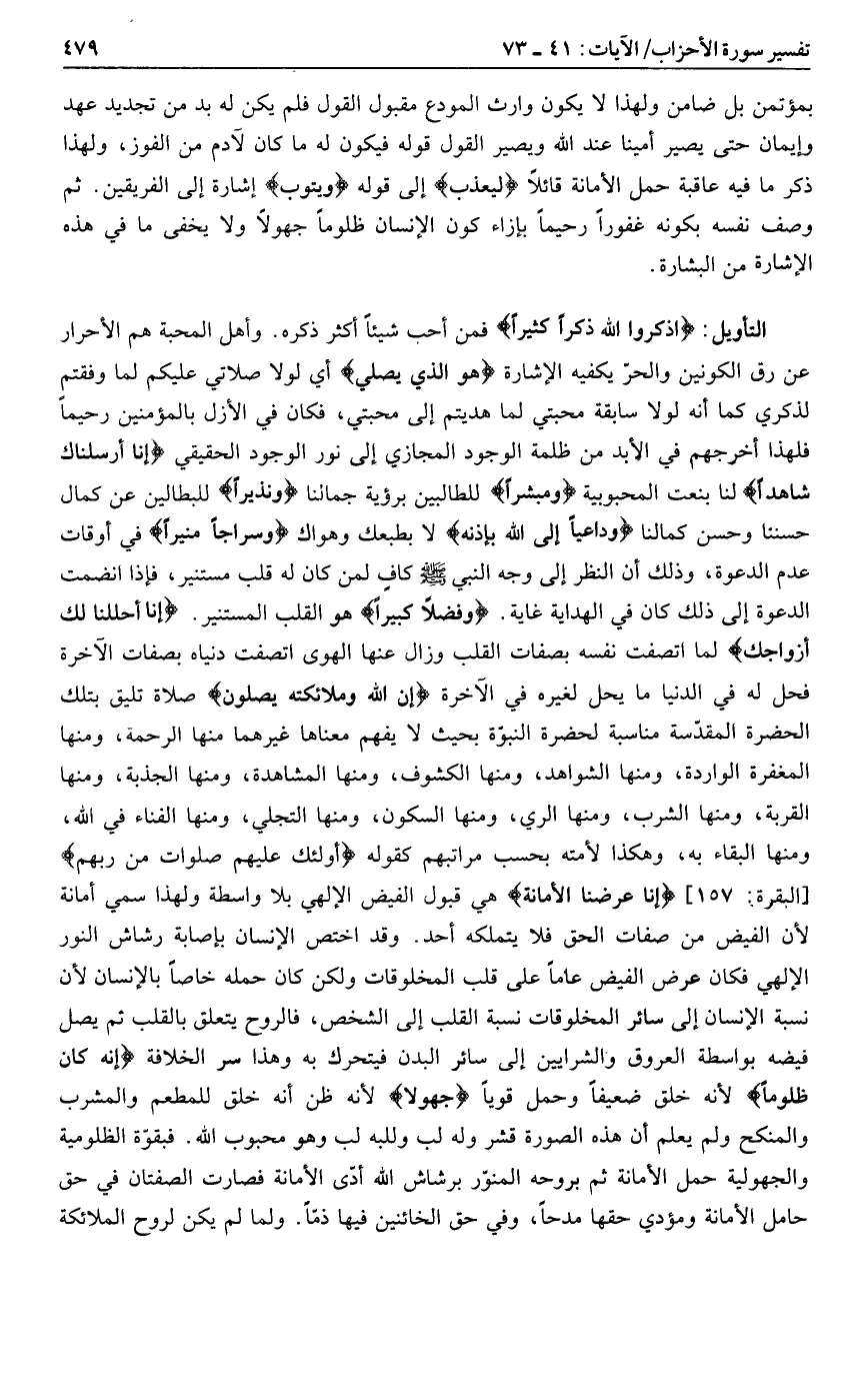 اذْكُرُوا اللَّهَ ذِكْراً كَثِيراً فمن أحب شيئا أكثر ذكره. وأهل المحبة هم الأحرار عن رق الكونين والحرّ يكفيه الإشارة هُوَ الَّذِي يُصَلِّي أي لولا صلاتي عليكم لما وفقتم لذكري كما أنه لولا سابقة محبتي لما هديتم إلى محبتي، فكان في الأزل بالمؤمنين رحيما فلهذا أخرجهم في الأبد من ظلمة الوجود المجازي إلى نور الوجود الحقيقي إِنَّا أَرْسَلْناكَ شاهِداً لنا بنعت المحبوبية وَمُبَشِّراً للطالبين برؤية جمالنا وَنَذِيراً للبطالين عن كمال حسننا وحسن كمالنا وَداعِياً إِلَى اللَّهِ بِإِذْنِهِ لا بطبعك وهواك وَسِراجاً مُنِيراً في أوقات عدم الدعوة، وذلك أن النظر إلى وجه النبي صلى الله عليه وسلم كاف لمن كان له قلب مستنير، فإذا انضمت الدعوة إلى ذلك كان في الهداية غاية. وفضلا كبيرا هو القلب المستنير. إِنَّا أَحْلَلْنا لَكَ أَزْواجَكَ لما اتصفت نفسه بصفات القلب وزال عنها الهوى اتصفت دنياه بصفات الآخرة فحل له في الدنيا ما يحل لغيره في الآخرة إِنَّ اللَّهَ وَمَلائِكَتَهُ يُصَلُّونَ صلاة تليق بتلك الحضرة المقدّسة مناسبة لحضرة النبوّة بحيث لا يفهم معناها غيرهما منها الرحمة، ومنها المغفرة الواردة، ومنها الشواهد، ومنها الكشوف، ومنها المشاهدة، ومنها الجذبة، ومنها القربة، ومنها الشرب، ومنها الري، ومنها السكون، ومنها التجلي، ومنها الفناء في الله، ومنها البقاء به، وهكذا لأمته بحسب مراتبهم كقوله أُولئِكَ عَلَيْهِمْ صَلَواتٌ مِنْ رَبِّهِمْ [البقرة: 157] إِنَّا عَرَضْنَا الْأَمانَةَ هي قبول الفيض الإلهي بلا واسطة ولهذا سمي أمانة لأن الفيض من صفات الحق فلا يتملكه أحد. وقد اختص الإنسان بإصابة رشاش النور الإلهي فكان عرض الفيض عاما على قلب المخلوقات ولكن كان حمله خاصا بالإنسان لأن نسبة الإنسان إلى سائر المخلوقات نسبة القلب إلى الشخص، فالروح يتعلق بالقلب ثم يصل فيضه بواسطة العروق والشرايين إلى سائر البدن فيتحرك به وهذا سر الخلافة إِنَّهُ كانَ ظَلُوماً لأنه خلق ضعيفا وحمل قويا جَهُولًا لأنه ظن أنه خلق للمطعم والمشرب والمنكح ولم يعلم أن هذه الصورة قشر وله لب وللبه لب وهو محبوب الله. فبقوّة الظلومية والجهولية حمل الأمانة ثم بروحه المنوّر برشاش الله أدّى الأمانة فصارت الصفتان في حق حامل الأمانة ومؤدي حقها مدحا، وفي حق الخائنين فيها ذمّا. ولما لم يكن لروح الملائكة