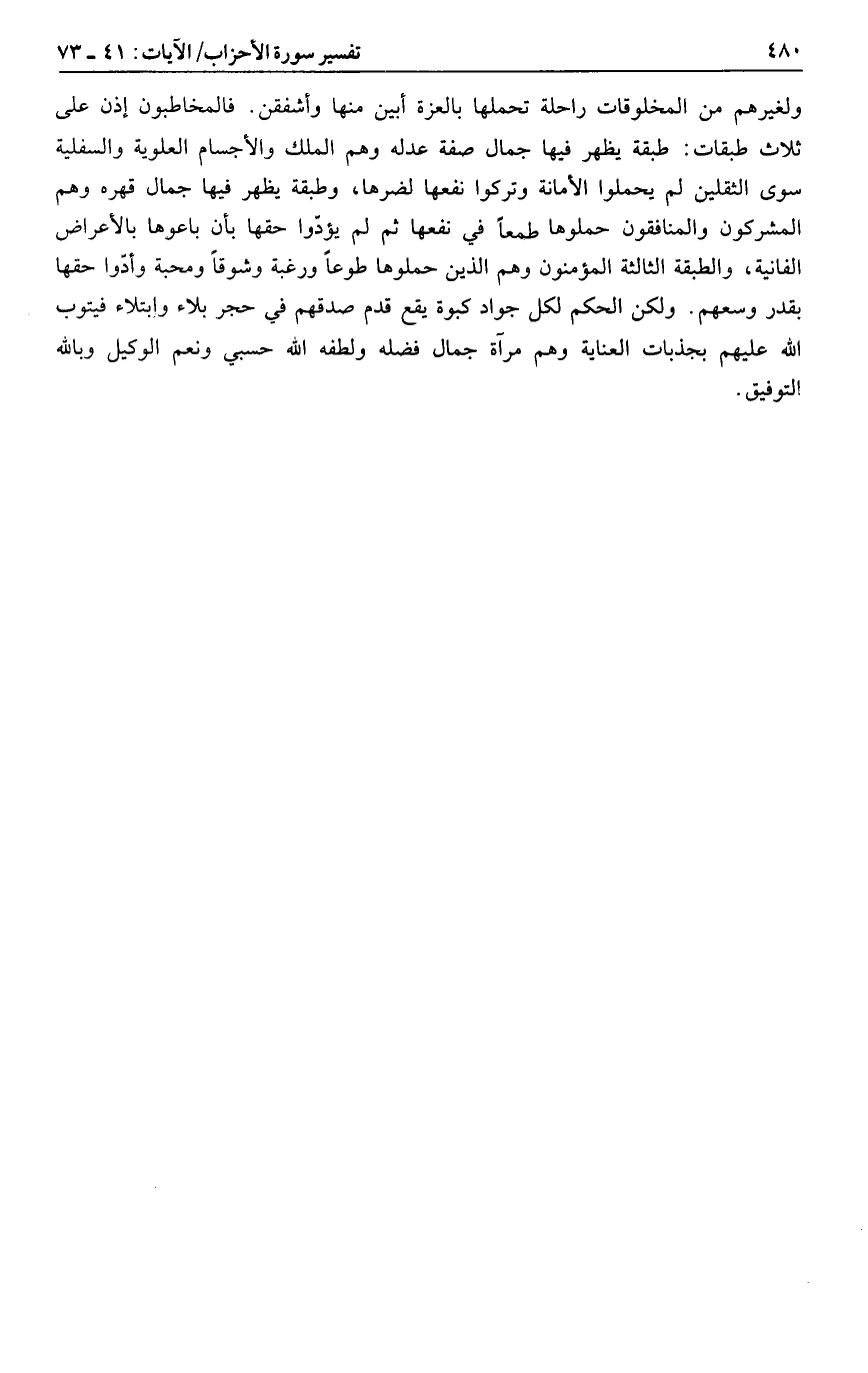 ولغيرهم من المخلوقات راحلة تحملها بالعزة أبين منها وأشفقن. فالمخاطبون إذن على ثلاث طبقات: طبقة يظهر فيها جمال صفة عدله وهم الملك والأجسام العلوية والسفلية سوى الثقلين لم يحملوا الأمانة وتركوا نفعها لضرها، وطبقة يظهر فيها جمال قهره وهم المشركون والمنافقون حملوها طمعا في نفعها ثم لم يؤدّوا حقها بأن باعوها بالأعراض الفانية، والطبقة الثالثة المؤمنون وهم الذين حملوها طوعا ورغبة وشوقا ومحبة وأدّوا حقها بقدر وسعهم. ولكن الحكم لكل جواد كبوة يقع قدم صدقهم في حجر بلاء وابتلاء فيتوب الله عليهم بجذبات العناية وهم مرآة جمال فضله ولطفه الله حسبي ونعم الوكيل وبالله التوفيق.