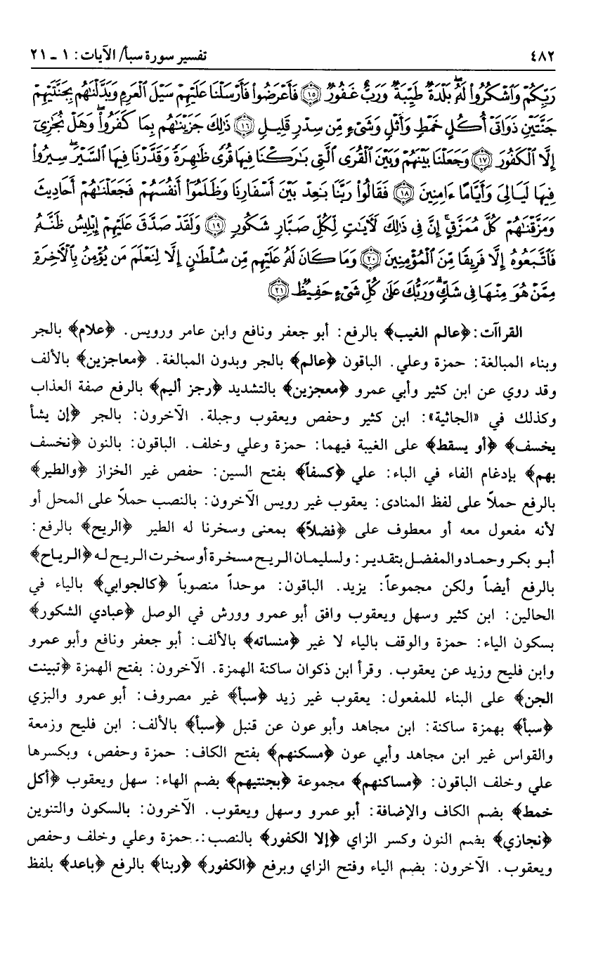 أبو بكر وحماد والمفضل بتقدير: ولسليمان الريح مسخرة أو سخرت الريح له الرياح بالرفع أيضا ولكن مجموعا: يزيد. الباقون: موحدا منصوبا كالجوابي بالياء في الحالين: ابن كثير وسهل ويعقوب وافق أبو عمرو وورش في الوصل عِبادِيَ الشَّكُورُ بسكون الياء: حمزة والوقف بالياء لا غير مِنْسَأَتَهُ بالألف: أبو جعفر ونافع وأبو عمرو وابن فليح وزيد عن يعقوب. وقرأ ابن ذكوان ساكنة الهمزة. الآخرون: بفتح الهمزة تَبَيَّنَتِ الْجِنُّ على البناء للمفعول: يعقوب غير زيد لِسَبَإٍ غير مصروف: أبو عمرو والبزي لِسَبَإٍ بهمزة ساكنة: ابن مجاهد وأبو عون عن قنبل لِسَبَإٍ بالألف: ابن فليح وزمعة والقواس غير ابن مجاهد وأبي عون مَسْكَنِهِمْ بفتح الكاف: حمزة وحفص، وبكسرها علي وخلف الباقون: مساكنهم مجموعة بِجَنَّتَيْهِمْ بضم الهاء: سهل ويعقوب أُكُلٍ خَمْطٍ بضم الكاف والإضافة: أبو عمرو وسهل ويعقوب. الآخرون: بالسكون والتنوين نُجازِي بضم النون وكسر الزاي إِلَّا الْكَفُورَ بالنصب: حمزة وعلي وخلف وحفص ويعقوب. الآخرون: بضم الياء وفتح الزاي وبرفع الْكَفُورَ ربنا بالرفع باعد بلفظ